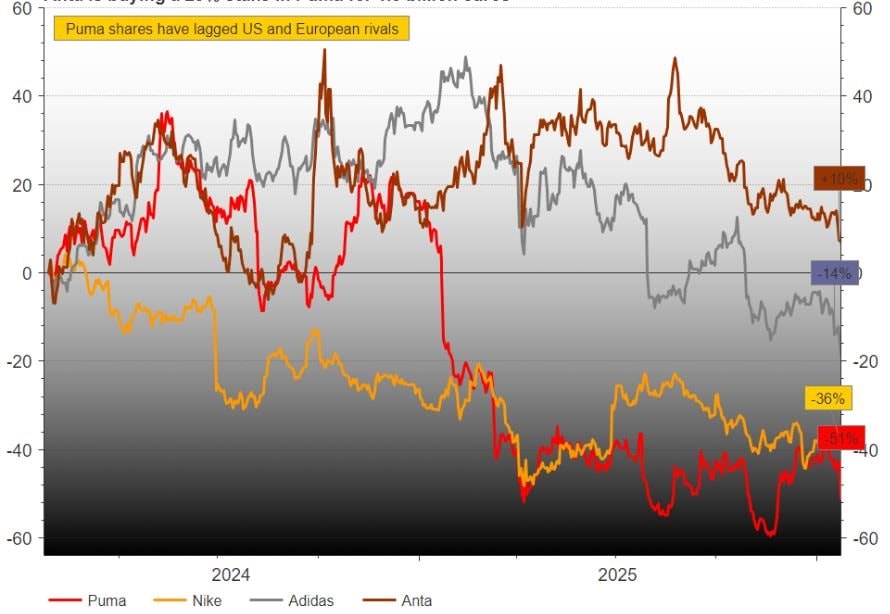 Anta Sports Products – thương hiệu đồ thể thao lớn nhất Trung Quốc – đã đạt thỏa thuận mua 29,06% cổ phần của Puma từ Artémis, công ty đầu tư thuộc gia đình tỷ phú Pinault, với giá 1,5 tỷ euro (khoảng 1,8 tỷ USD). Giao dịch này đưa Anta trở thành cổ đông lớn nhất của Puma, song Anta khẳng định không có kế hoạch thâu tóm toàn bộthương hiệu thể thao Đức.