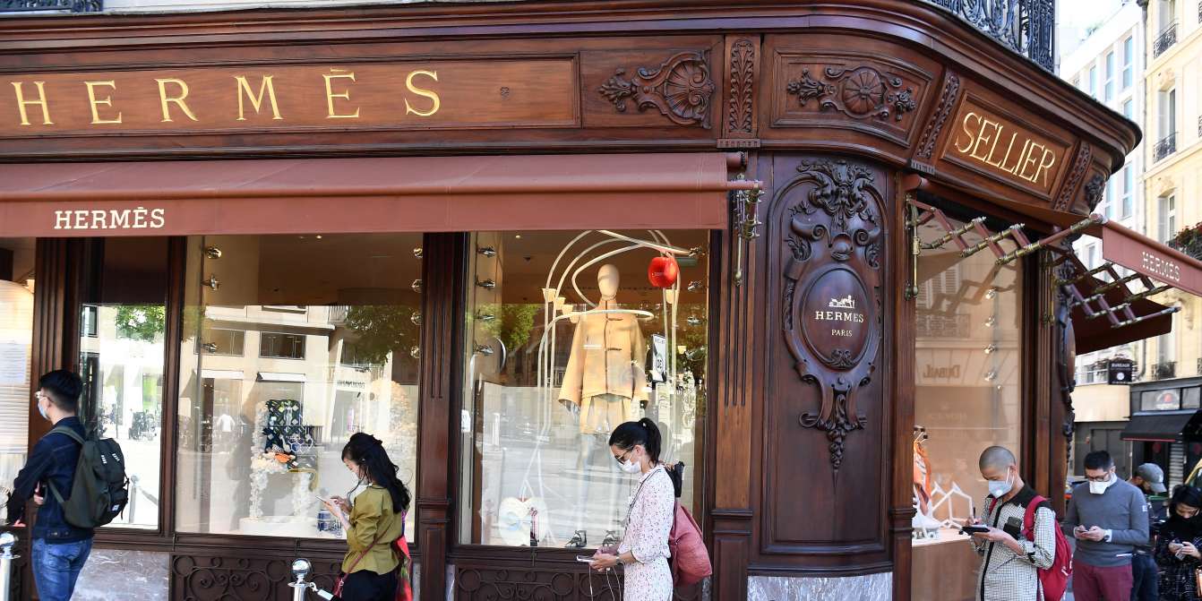 People wearing protective face masks respect social distancing measures as they queue in front of the Hermes store on the George V avenue in Paris on May 20, 2020, after France eased lockdown measures taken to curb the spread of the COVID-19, caused by the novel coronavirus. (Photo by ALAIN JOCARD / AFP)