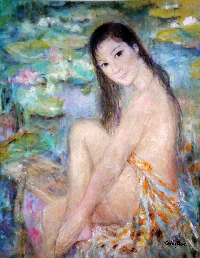 Lê Thị Lựu, Thiếu nữ tắm hồ sen, lụa, 55x46cm, khoảng 1971-1972
