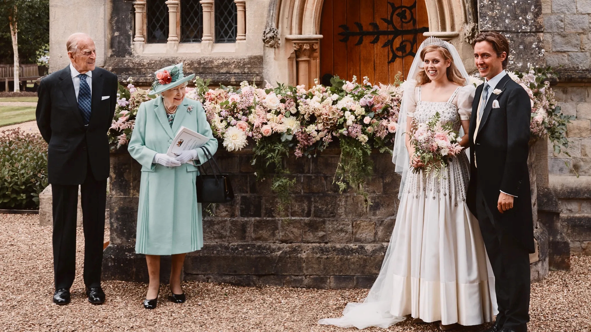 Ngày nay, chiếc vương miện vẫn tiếp tục được sử dụng trong hôn lễ hoàng gia. Trong ảnh là Nữ hoàng Elizabeth II và phu quân Philip, tại ngày cưới của cháu gái Beatrice và cháu rể Edoardo Mapelli Mozzi; ảnh chụp sau lễ cưới, tại khuôn viên Royal Lodge, Windsor, Vương quốc Anh, ngày 18 tháng 7 năm 2020. Ảnh chụp bởi Benjamin Wheeler/via Getty Images. Nguồn: Only Natural Diamonds
