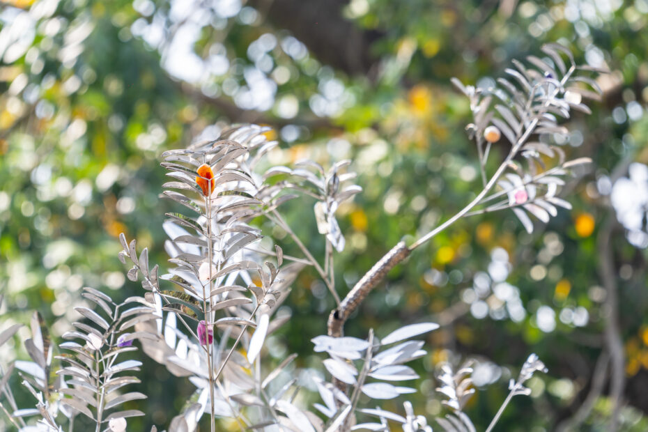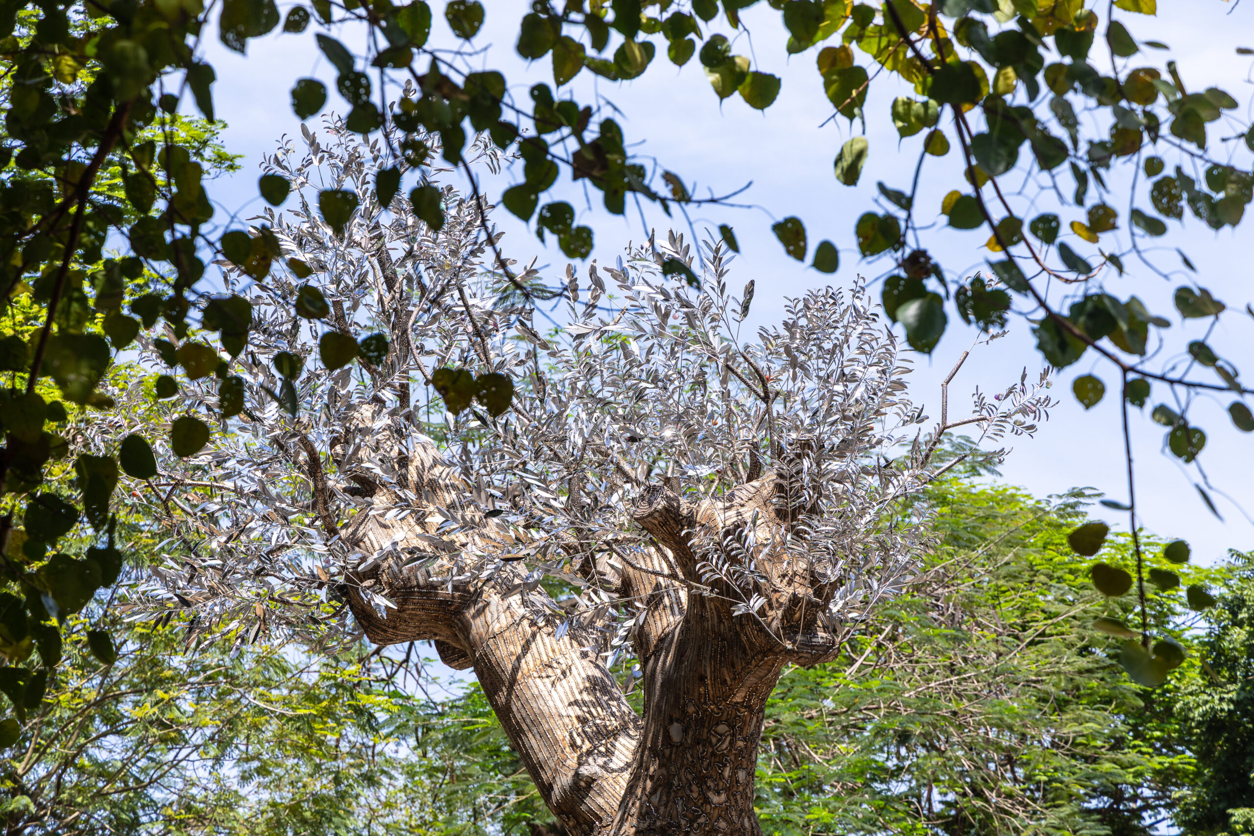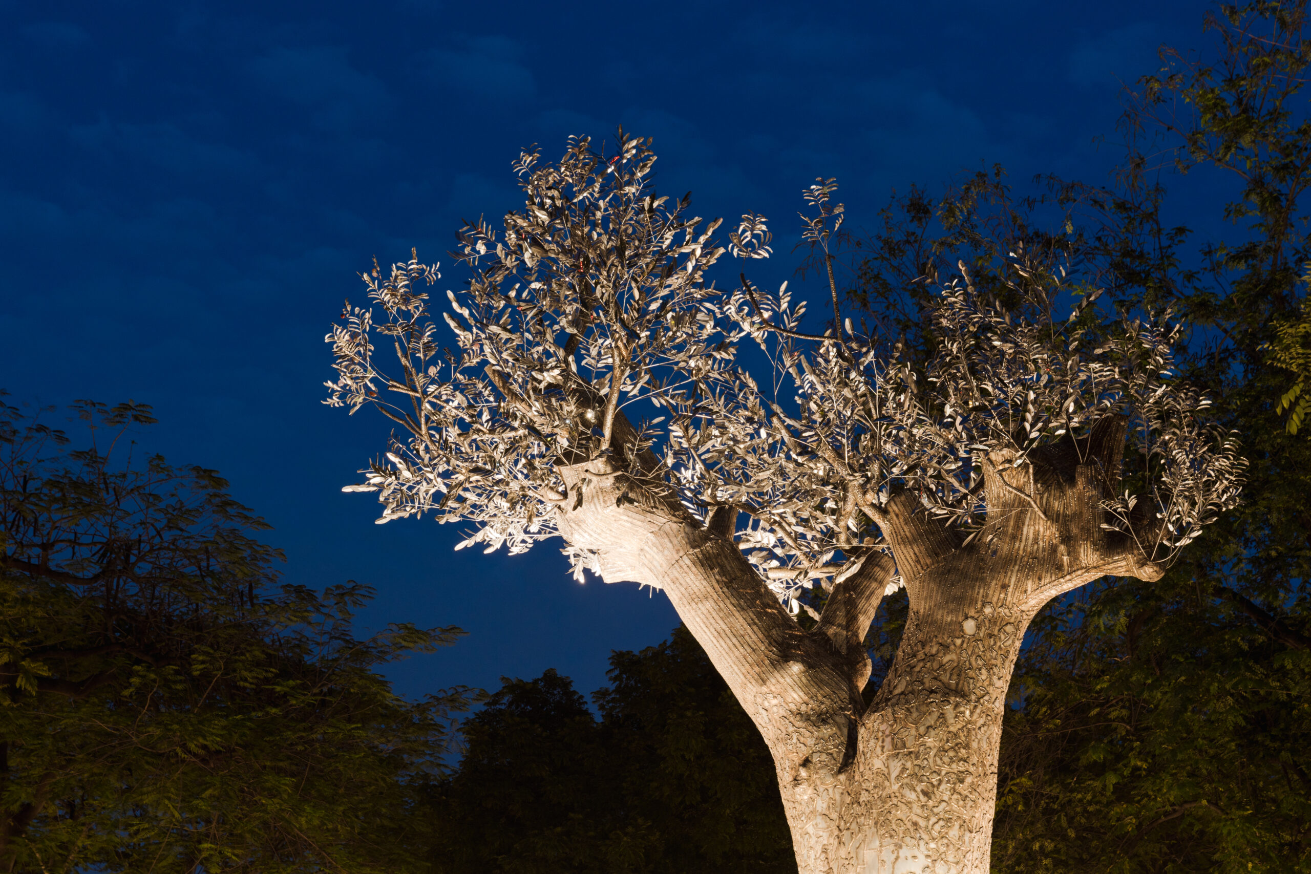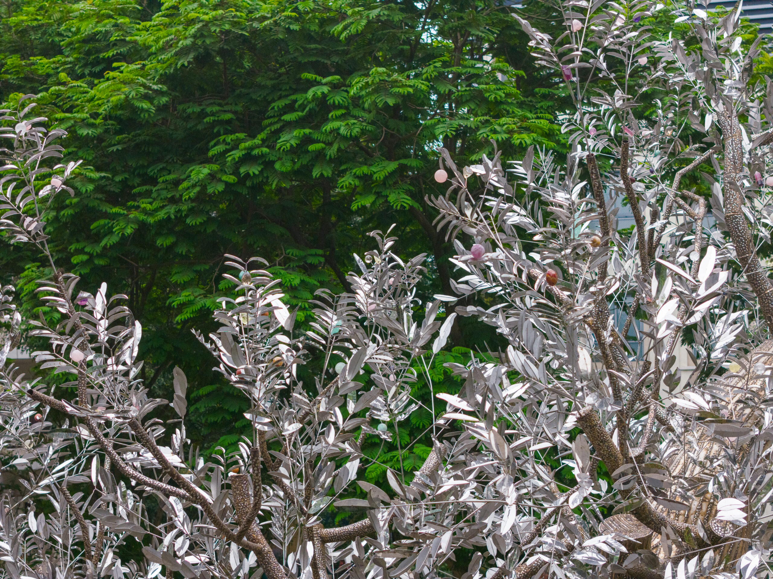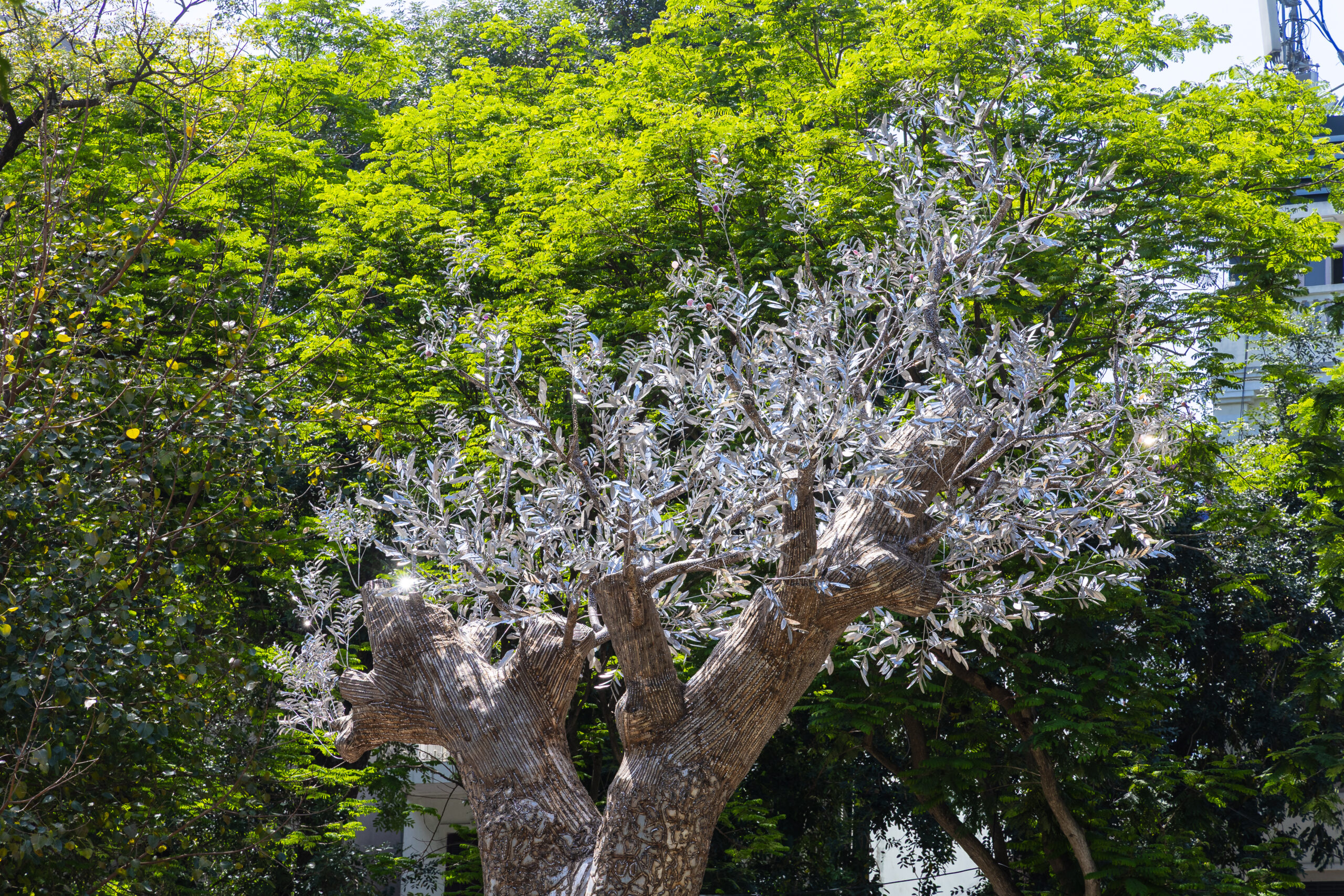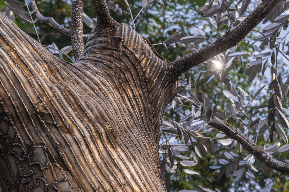 Đầu tiên, các tấm thép không gỉ dày 5 milimet được gò thủ công, ôm theo hình dáng của thân cây. Tiếp theo, những người thợ sẽ hàn kín, đồng thời tạo ra những nốt và rãnh xù xì bám vào lớp vỏ cây gồ ghề, để tạo nên một lớp vỏ bọc ánh kim ngũ sắc, phản chiếu khi ánh sáng rọi vào. Lớp kim loại bên ngoài này vừa là khung tác phẩm, vừa là lớp trang sức đầy sức hút của cây. Cành cây được tạo hình mô phỏng sự khúc khuỷu tự nhiên và tán lá tươi tốt tựa như cành cây thật. Hàng nghìn chiếc lá bằng thép óng ánh và “hoa” từ đá thạch anh đủ sắc màu, reo ca dưới ánh nắng.