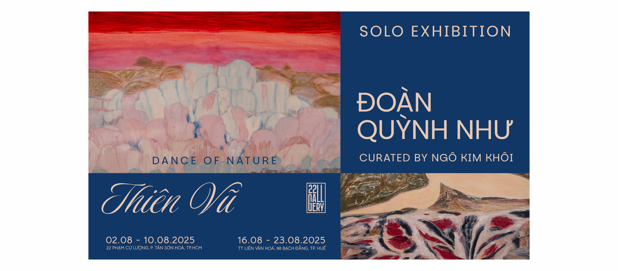 Triển lãm “Thiên Vũ” ra mắt 27 tác phẩm acrylic trên toan được họa sĩ Đoàn Quỳnh Như sáng tác trong năm 2025, do 22 Gallery tổ chức, với sự giám tuyển của nhà nghiên cứu Ngô Kim Khôi, diễn ra lần lượt tại TP. HCM và TP. Huế trong tháng 8 năm 2025.