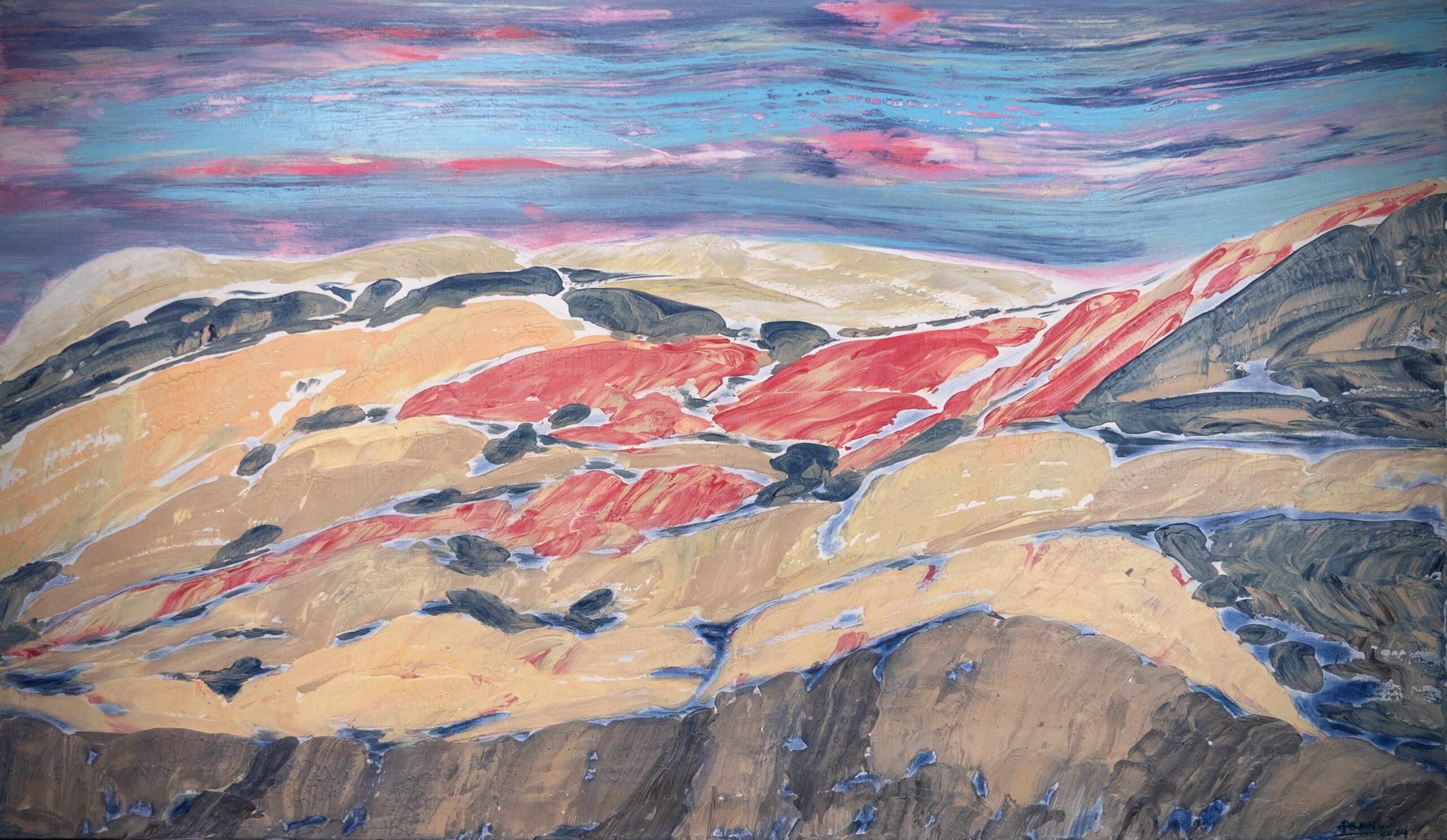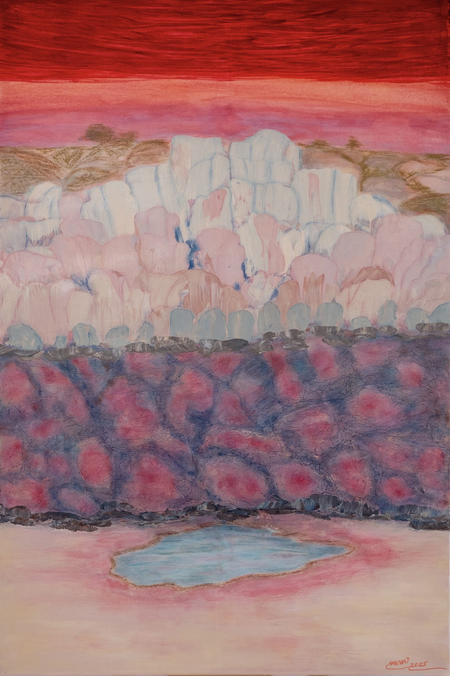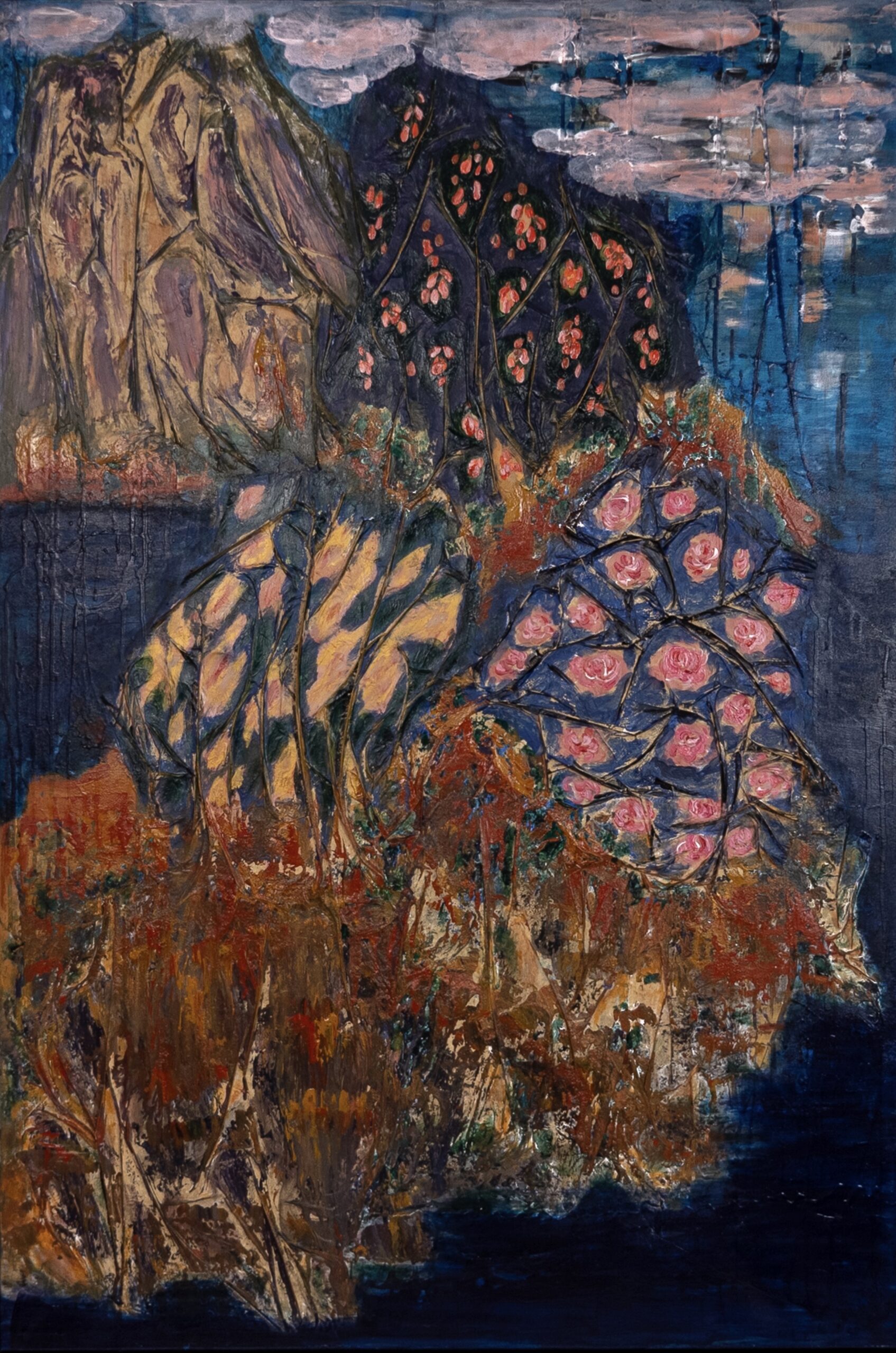 Tuy vậy, hy vọng vẫn âm ỉ giữa sắc màu tưởng như tuyệt vọng. Những đóa hồng rực rỡ giữa đá núi, những dòng suối đỏ thắm vắt ngang nền xanh – những biểu tượng của sự tái sinh, sự kiên cường và ấm áp của thiên nhiên nếu được yêu thương trở lại. Nét cọ ở đây trở nên bản lĩnh hơn, chồng lớp dày hơn, tạo nên một chiều sâu xúc cảm như lời cầu nguyện tha thiết: “Cho chếnh choáng mùi thơm, cho đã đầy ánh sáng, / Cho no nê thanh sắc của thời tươi.” (Xuân Diệu, “Vội vàng”).