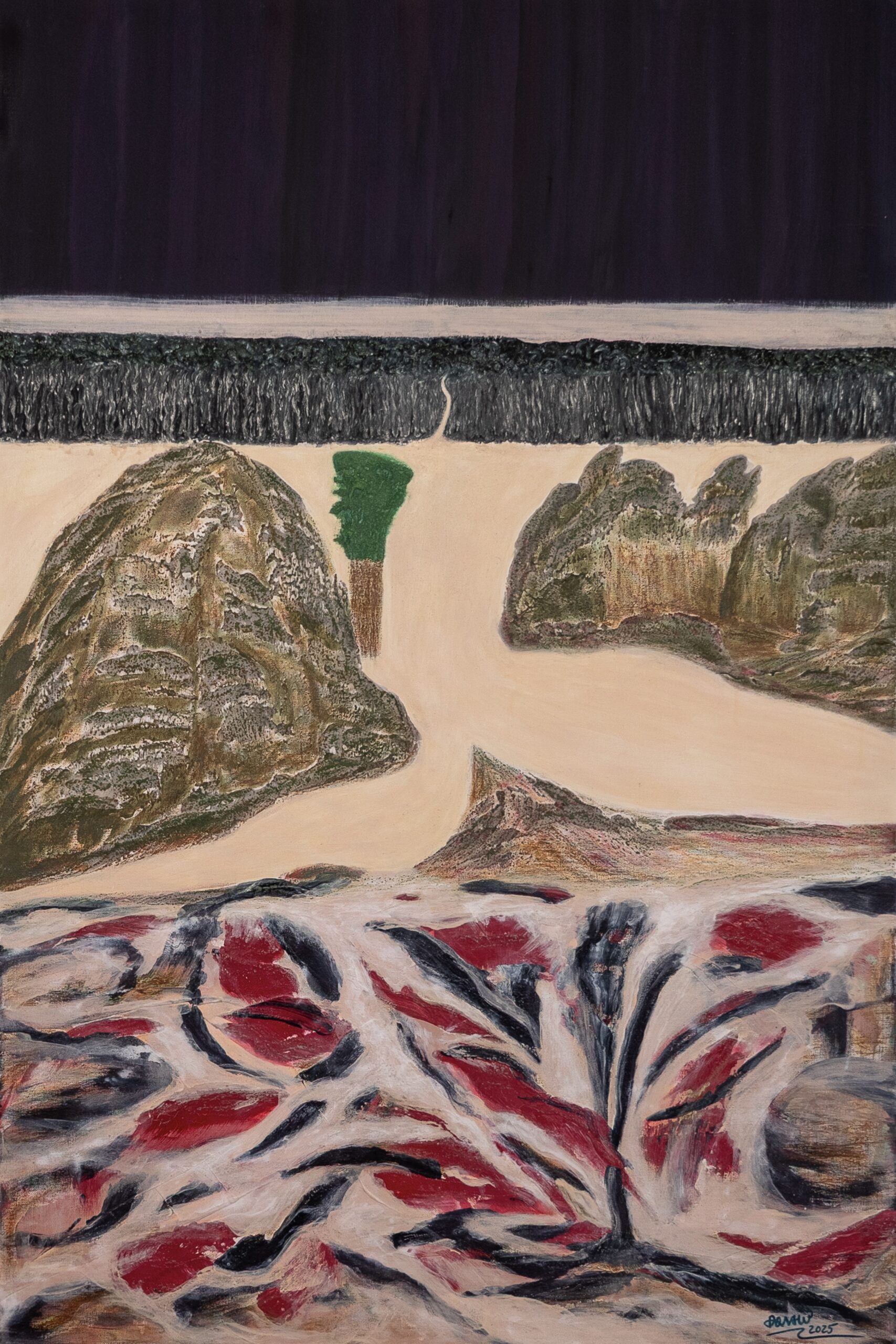 Một số tác phẩm đưa ta vào sa mạc, nơi cây khô vươn lên dưới nền trời tro xám – hình ảnh ấy không bi kịch mà trầm lặng, đầy nội lực, như thể đất mẹ – dù mỏi mệt – vẫn chưa ngừng sinh sôi. Từng nét cọ thô ráp nhưng kiên định gợi lên sức sống tiềm tàng, như từng tiếng thầm thì: “Đố ai tát cạn mạch sầu / Thì ta để tóc lên cầu đón ai.” (Phạm Thiên Thư, “Đưa em tìm động hoa vàng”).
