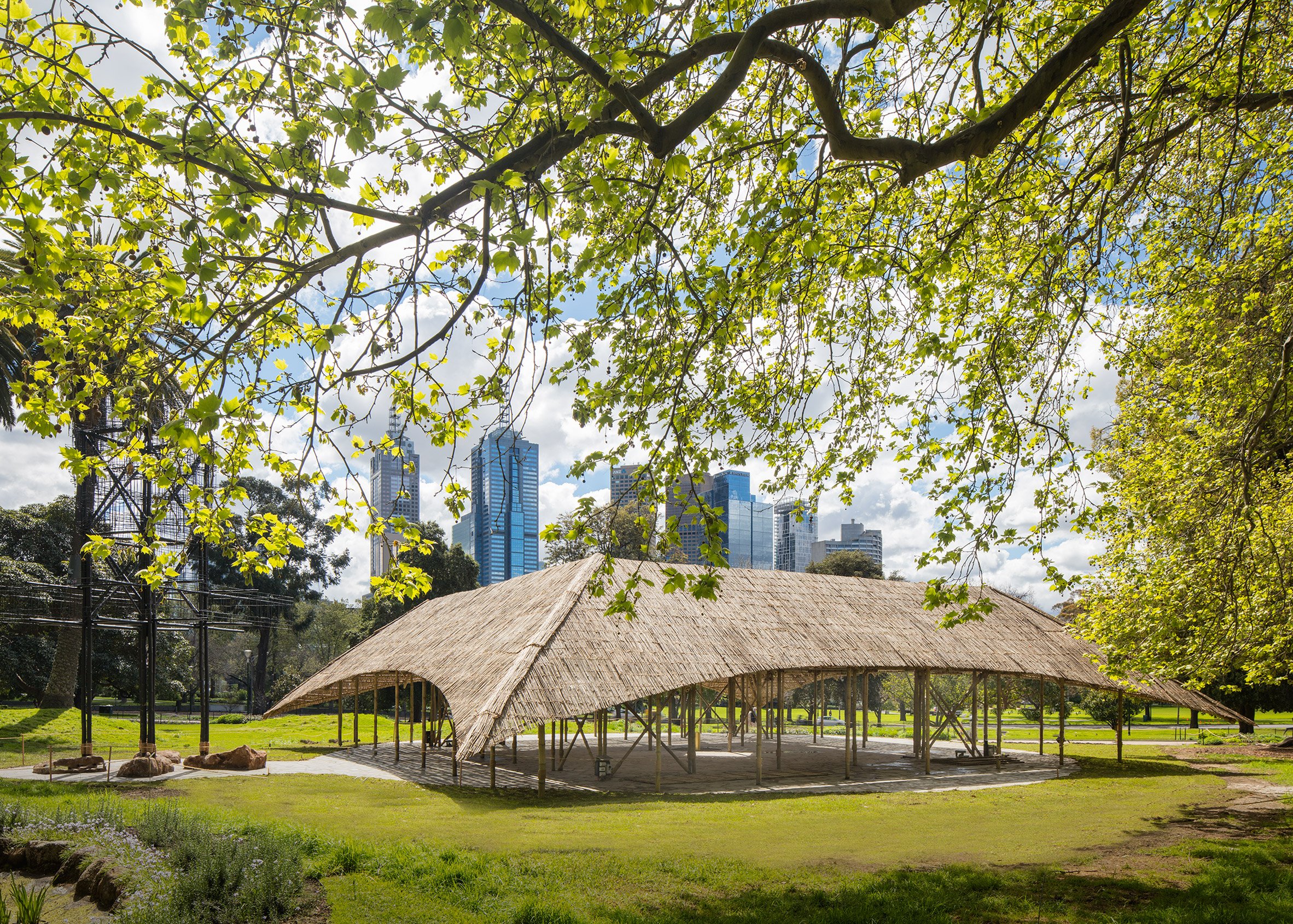 Triết lý ấy được hiện thực hóa thành những công trình kiến trúc đôi khi giống một tác phẩm điêu khắc trong cảnh quan hơn là một ngôi nhà. Ta có thể thấy rõ điều này tại Palmyra House (2007), nơi hai cấu trúc gỗ được che chắn bởi những cánh cửa làm từ thân cọ, cho phép gió biển và ánh sáng nhẹ nhàng xuyên qua, khiến ngôi nhà như đang “thở” cùng khu rừng dừa xung quanh. Trong khi đó, xưởng dệt Ganga Maki (2017) dưới chân dãy Himalaya lại là một “bản viết chồng” văn hóa tuyệt đẹp, bởi công trình dành cho một nghệ nhân Nhật Bản nhưng được xây dựng từ gạch, vôi, đá và kỹ thuật thủ công của người Ấn Độ. Tầm vóc triết lý của ông có lẽ được thể hiện rõ nhất qua MPavilion (2016) ở Melbourne. Một công trình đồ sộ được làm hoàn toàn thủ công từ những vật liệu gần gũi như tre, đá và dây thừng. Nó không phải để “ở”, mà là một không gian để mọi người gặp gỡ, tương tác và khám phá, làm mờ đi lằn ranh giữa kiến trúc, nghệ thuật và một chốn tĩnh tâm.