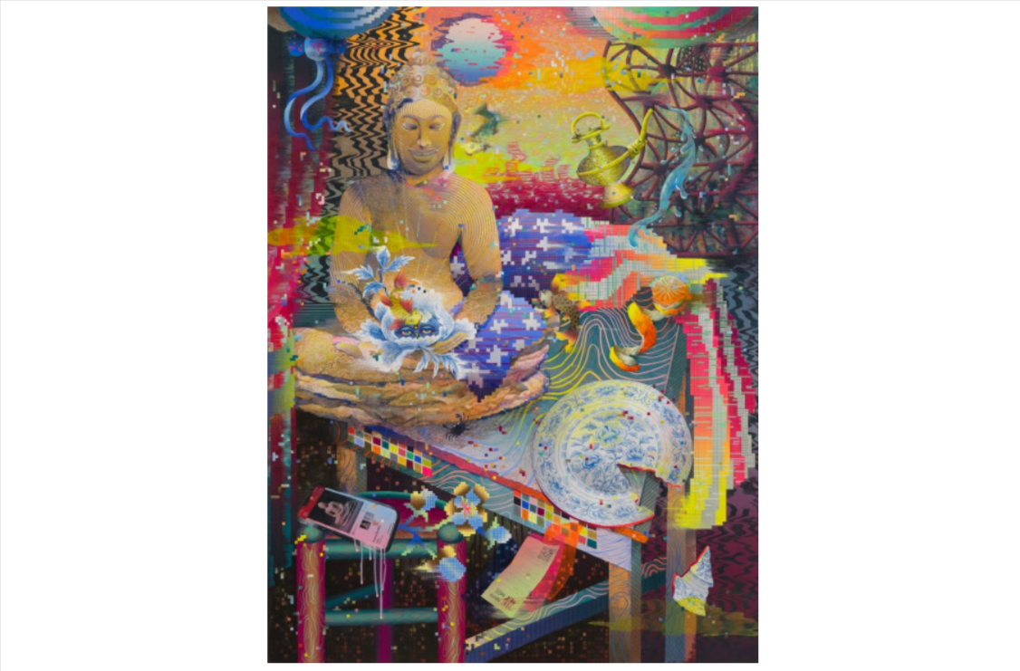 Bùi Thanh Tâm, “Nothing behind I” (2019) – tạm dịch: “Không có gì ở phía sau I”, ghép dán tranh dân gian Kim Hoàng, Hàng Trống, Đông Hồ, vàng lá, acrylic trên canvas, 180 x 125 cm. Nguồn ảnh: Eli Klein Gallery