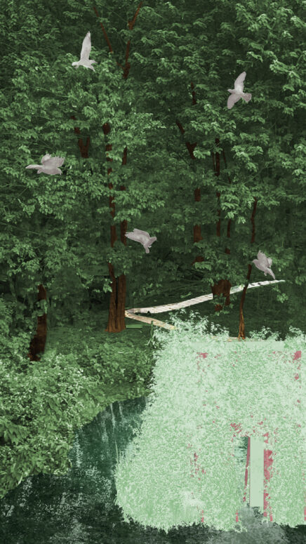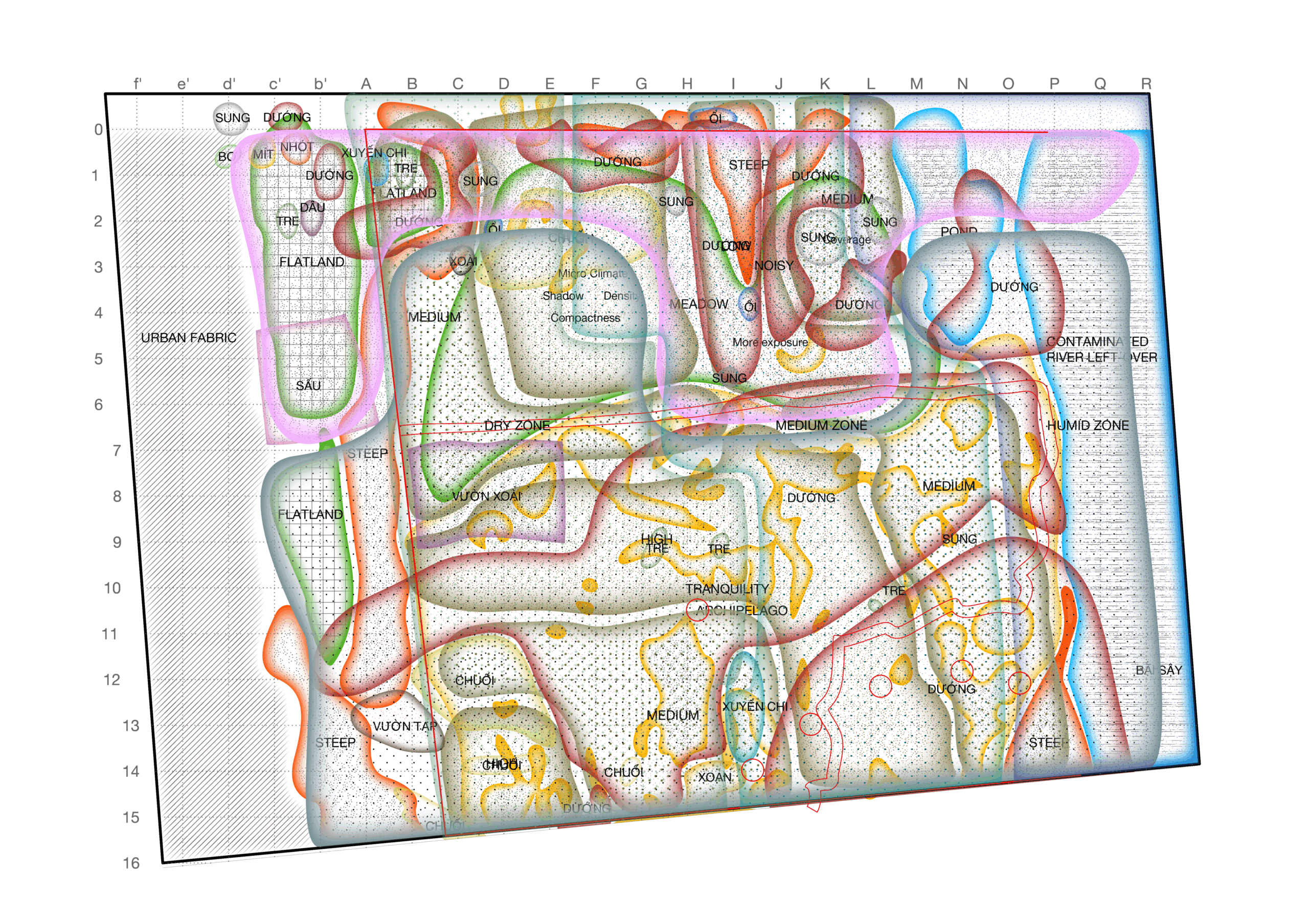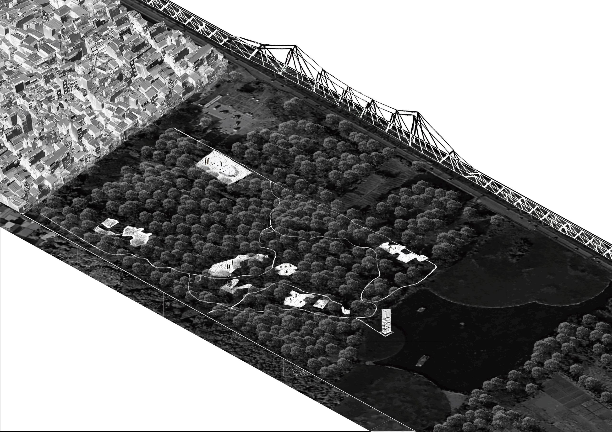 - Dự án “House of Forest” tái tổ chức địa điểm bờ vở sông Hồng thành một cảnh quan trung gian, liên tục tái lập mối quan hệ cân bằng giữa các nhân tố đối lập nhưng buộc phải tồn tại cùng nhau. Nguồn: Hanoi Ad hoc
