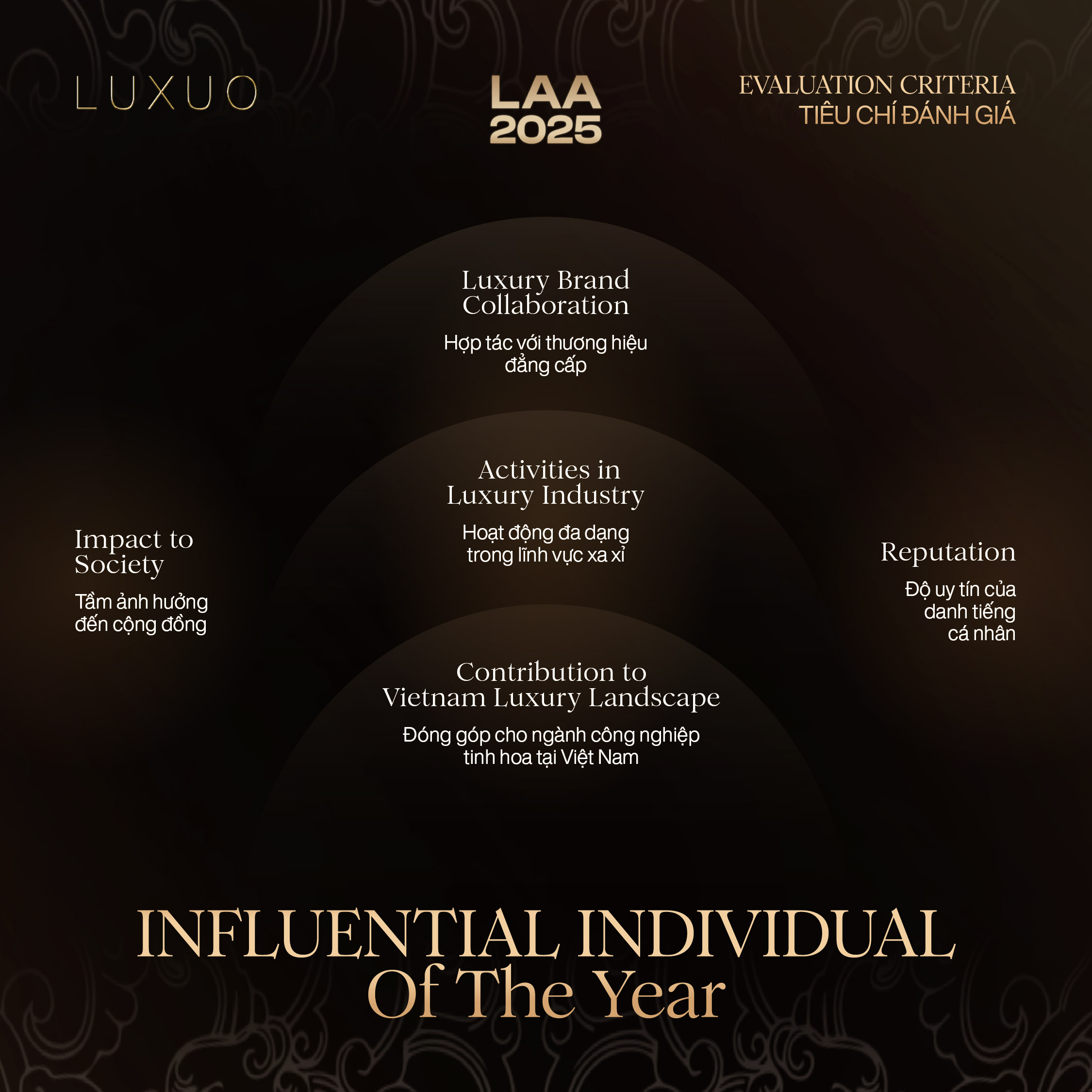 Dựa trên những tiêu chí này, hạng mục “Influential Individual of the Year” tại LUXUO ASIA AWARDS 2025 tôn vinh những cá nhân có sức ảnh hưởng nổi bật, những người đã tạo dấu ấn rõ nét trong ngành cao cấp trong thị trường liên tục thay đổi. Giải thưởng ghi nhận những gương mặt có khả năng định hình xu hướng, lan tỏa giá trị thẩm mỹ, truyền cảm hứng thông qua hành động và tư duy, đồng thời góp phần thúc đẩy sự phát triển văn hóa cao cấp tại Việt Nam theo hướng hiện đại, giàu bản sắc và bền vững.