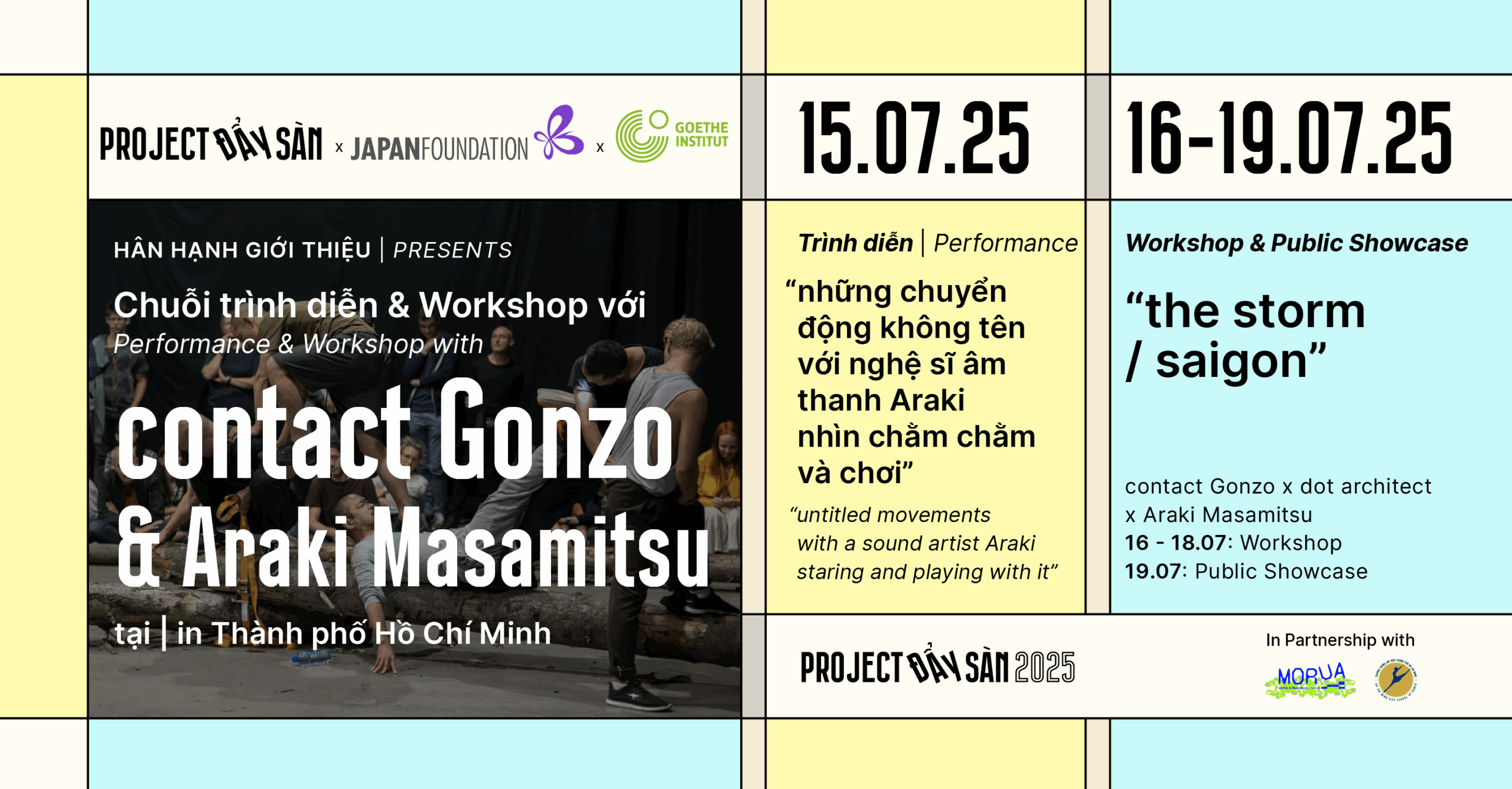 Tháng 7 này, Project Đẩy Sàn cùng Trung Tâm Giao lưu Văn hóa Nhật Bản tại Việt Nam, với sự đồng hành của Goethe-Institut Thành phố Hồ Chí Minh, MORUA và Trường Múa Thành phố Hồ Chí Minh giới thiệu tới công chúng các buổi biểu diễn đến từ nhóm nghệ sĩ trình diễn contact Gonzo và nghệ sĩ âm thanh Masamitsu Araki.