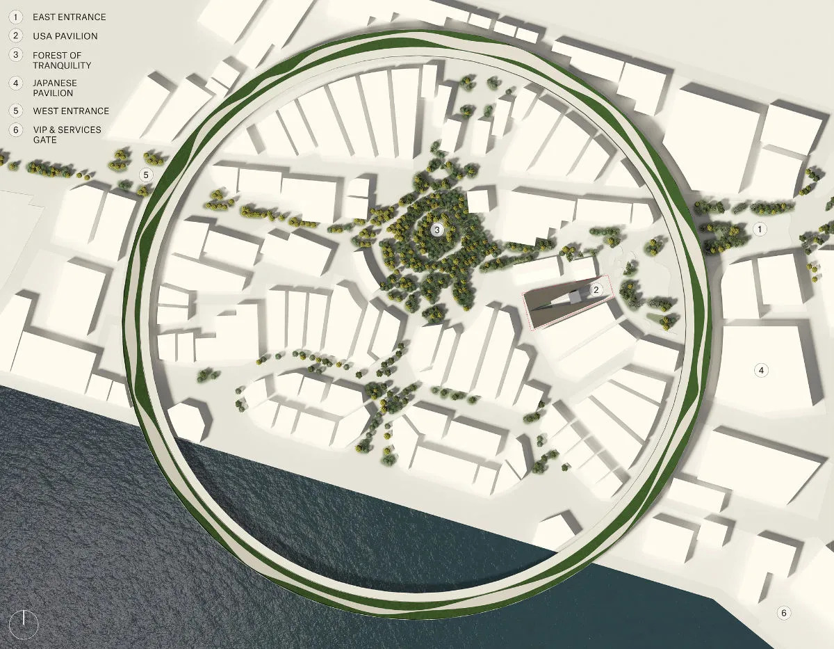 Trong mạng lưới Voronoi này, “Vòng cung lớn” (Grand Ring) bằng gỗ, một thiết kế của văn phòng kiến trúc sư Sou Fujimoto, đóng vai trò như một yếu tố liên kết và định hình chu vi, nhưng không phải là một trung tâm thống trị. Bên trong vòng cung, các gian hàng xen kẽ với các không gian mở và các khu vực xanh. Một trong những không gian xanh đáng chú ý là khu vực có tên gọi “Khu rừng tĩnh lặng” (静寂の森 – Forest of Tranquility), được bố trí gần trung tâm, tạo ra một khoảng lặng, một điểm cân bằng tự nhiên giữa các hoạt động sôi nổi của các gian hàng. Vật liệu gỗ của “Vòng cung lớn” và sự hiện diện của “rừng” cùng nhấn mạnh ưu tiên về tính bền vững và chất lượng sống.