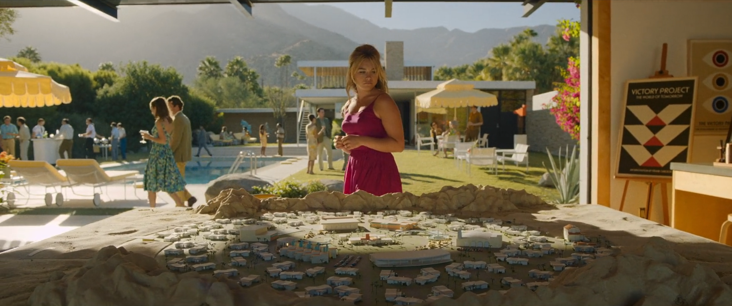 Nếu khu ngoại ô là nơi của sự tuân thủ, thì ngôi nhà của Frank, kẻ cầm đầu Dự án Victory, là pháo đài của sự kiểm soát. Đó chính là Kaufmann Desert House, một công trình kiến trúc có thật được thiết kế bởi Richard Neutra vào năm 1946. Ý tưởng kiến trúc của Neutra, được gọi là “biorealism”, nhấn mạnh sự hòa hợp giữa con người và thiên nhiên, sử dụng các bức tường kính lớn và không gian mở để xóa nhòa ranh giới giữa trong nhà và ngoài trời. Việc lựa chọn đưa công trình này vào phim còn được truyền cảm hứng trực tiếp từ bức ảnh “Poolside Gossip” (1970) của Slim Aarons, một biểu tượng của sự sang trọng và lạc quan mà Olivia Wilde đã treo trên tường trong quá trình viết kịch bản.