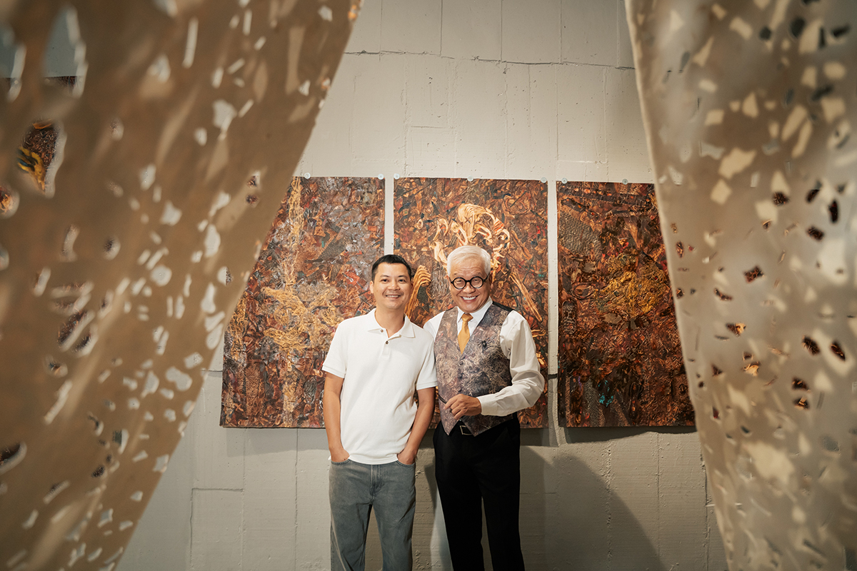 Phạm Trần Việt Nam (trái) và nhà nghiên cứu Ngô Kim Khôi (phải) trong không gian triển lãm “Vòng Sinh Tử”.