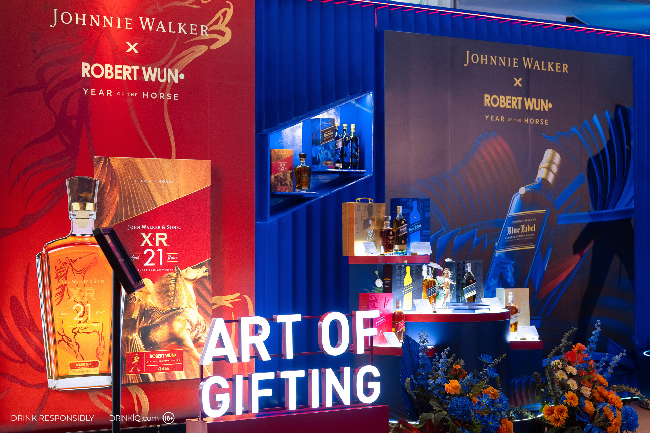 Những tặng phẩm của nhà Johnnie Walker cho năm 2026 được bày trí bắt mắt cùng bộ sưu tập chính từ Robert Wun.