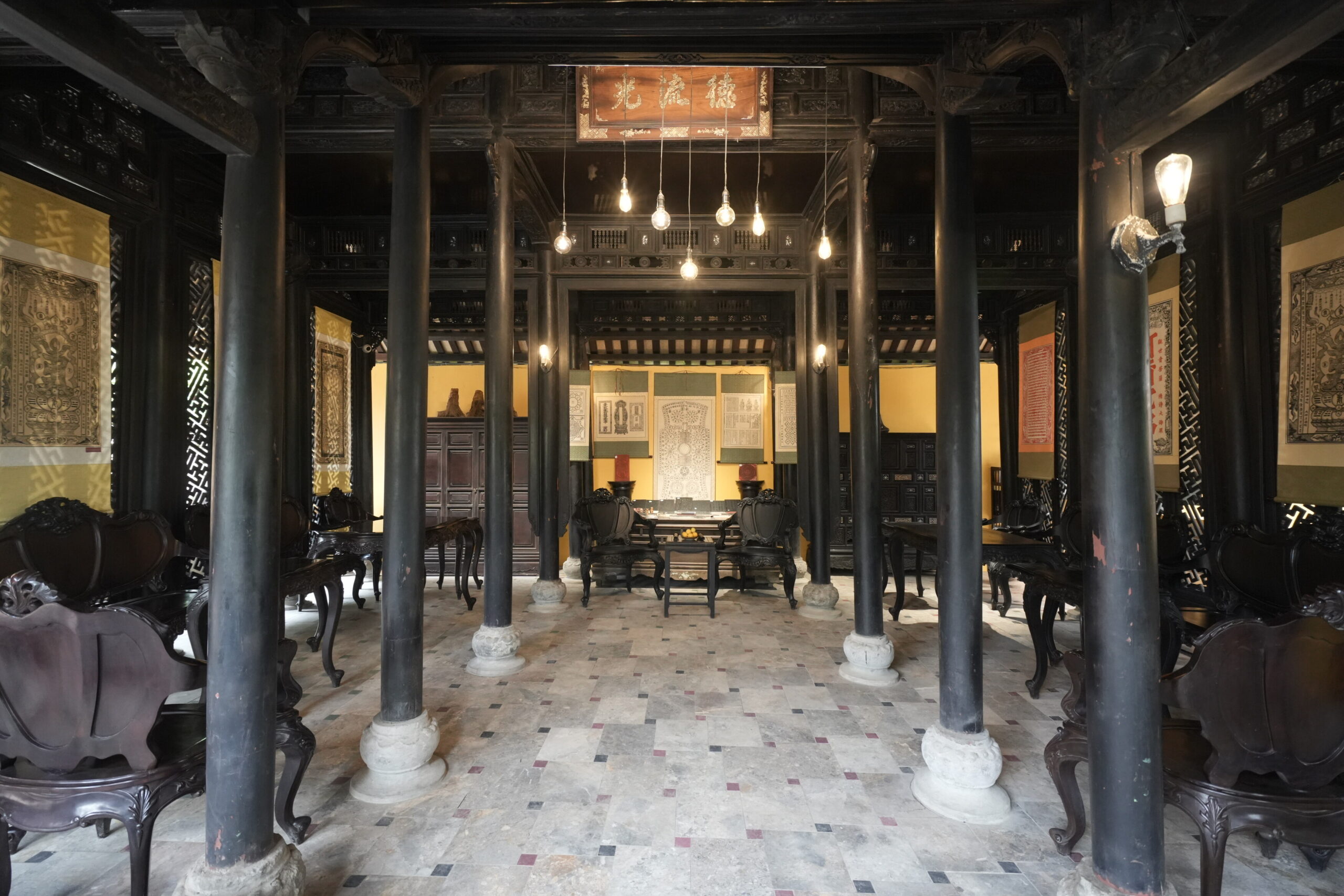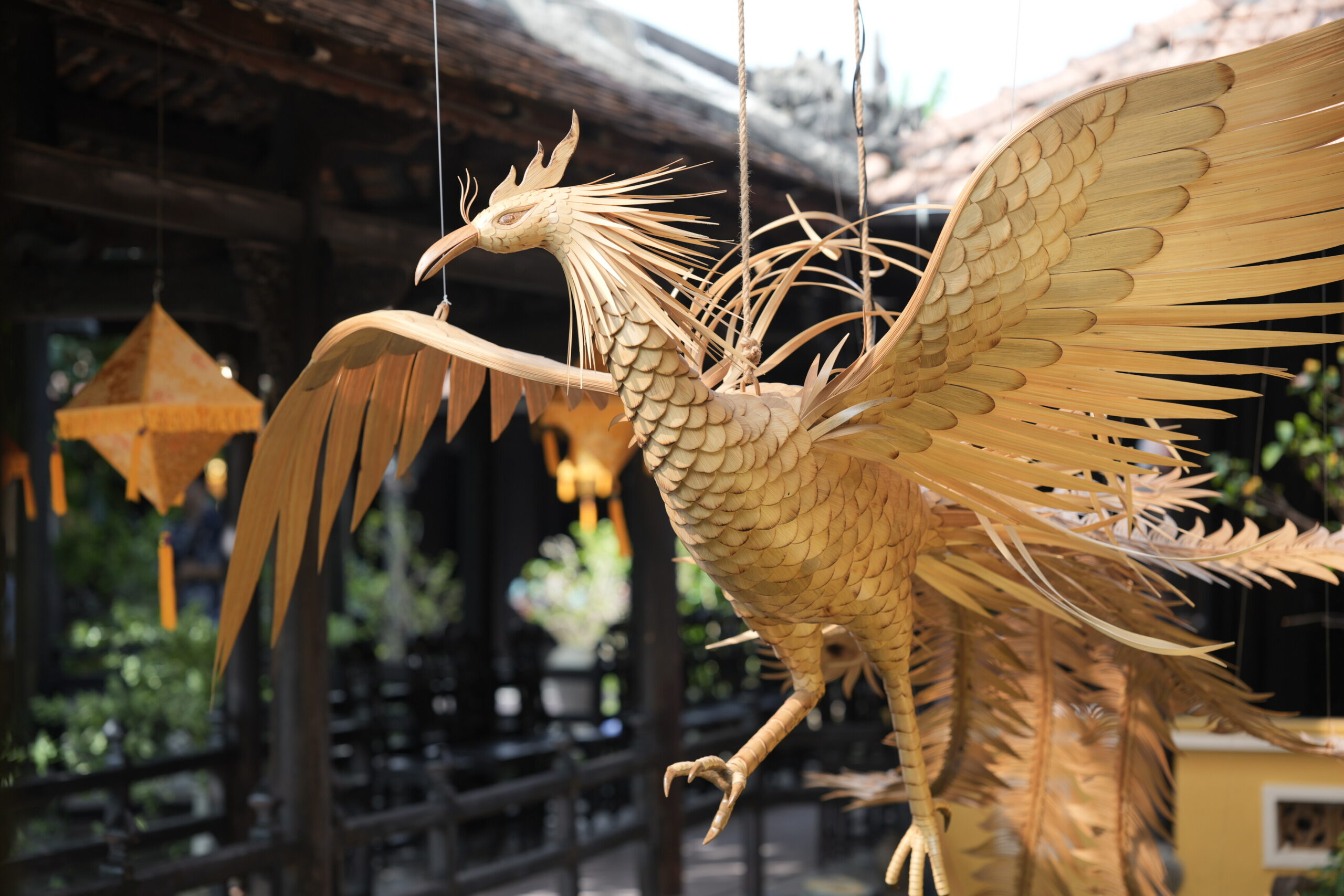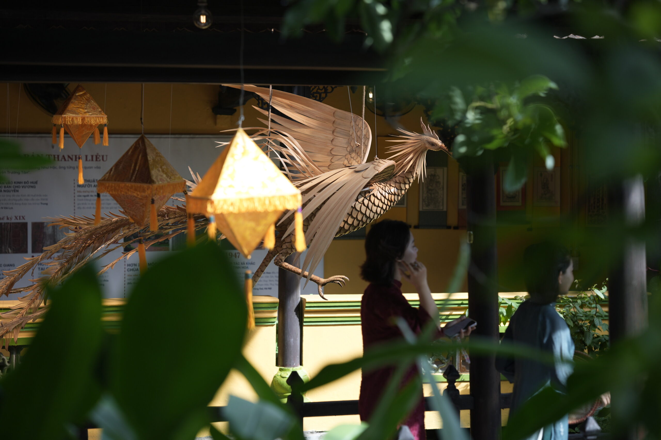 Bước qua tam quan, dọc hành lang là ánh đèn vàng dịu và chim phượng tre đan thủ công do nghệ nhân Tân Võ (Hội An) chế tác, sải cánh dưới mái hiên như dẫn lối vào một không gian văn hóa đang sống. Nhà rường trung tâm với hệ cột gỗ đen bóng, hoành phi câu đối được kích hoạt thành phòng trưng bày sống: bản in mộc bản treo dọc hiên, dụng cụ nghề bày trên bàn gỗ, kể lại câu chuyện về bàn tay người thợ Thanh Liễu từng góp mặt trong những bộ mộc bản phục vụ triều đình.