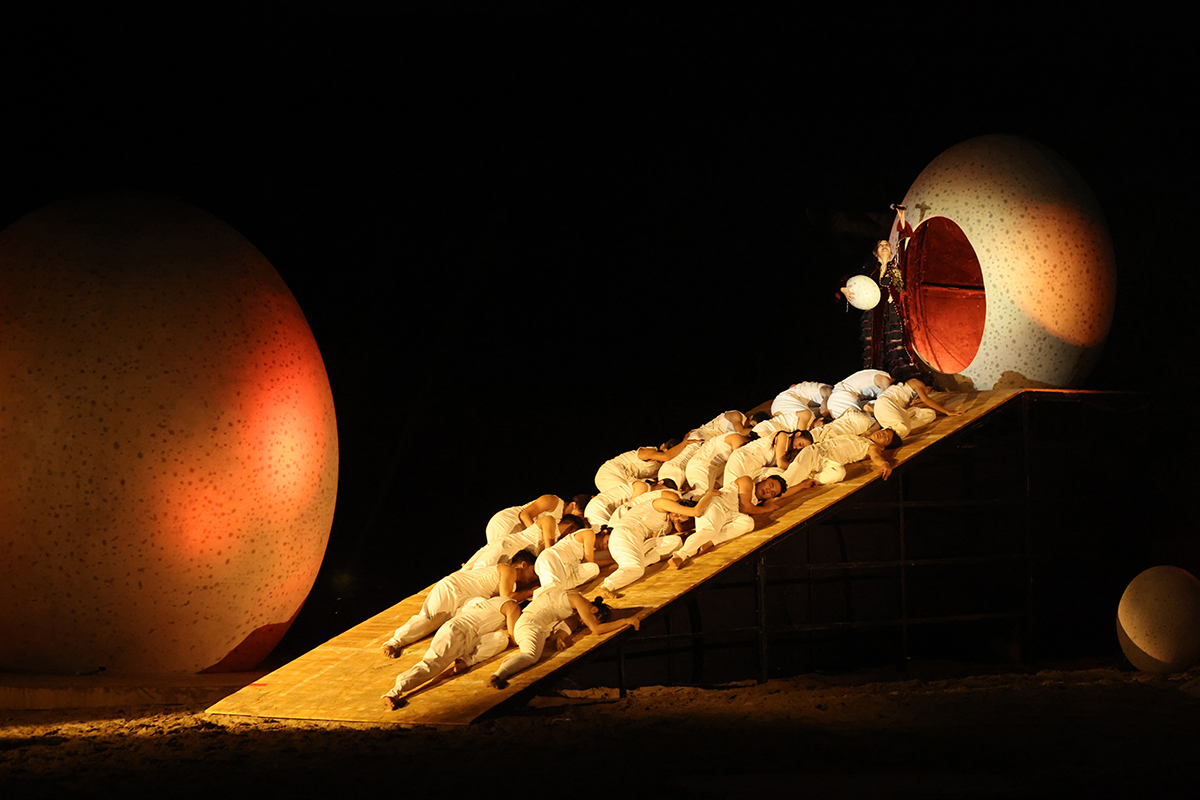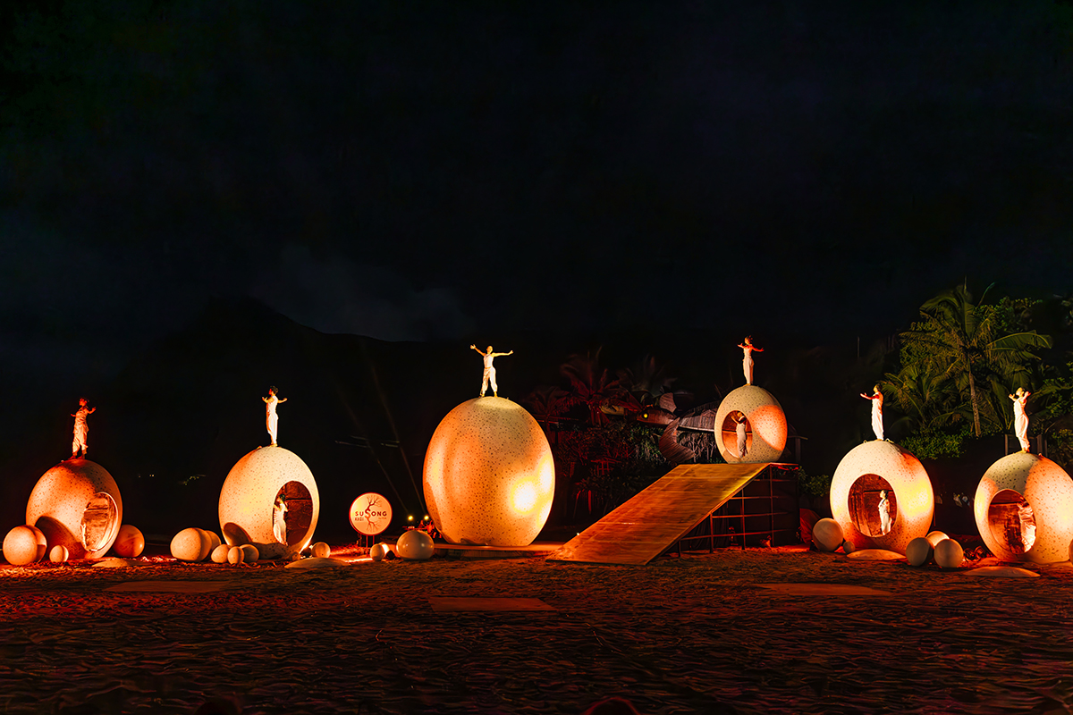 Tiếp theo là nghệ thuật trình diễn thực cảnh, mang hơi thở đương đại trong nguồn mạch dân gian, bởi Tổng Đạo diễn Cao trung Hiếu. Sân khấu được dàn dựng trải rộng giữa thiên nhiên kỳ vĩ – nơi sóng biển làm nhạc nền, núi Voi và rừng cây thành phông cảnh và cát trắng trở thành tấm thảm dẫn lối cho cảm xúc. Sân khấu là những quả trứng lớn đặt giữa không gian thiên nhiên, là biểu tượng của sự khởi sinh, trong sự hòa hợp với thiên nhiên, mang thông điệp bảo tồn môi trường biển, gợi nhắc về mối liên kết giữa con người và sự sống nguyên bản.