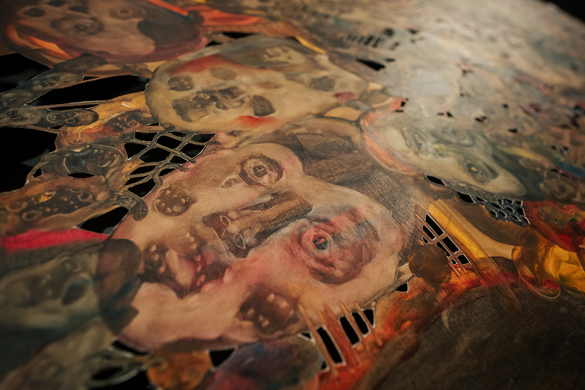 Những khuôn mặt hãi hùng trong tranh của Phạm Trần Việt Nam (ảnh trên) được ứng dụng kỹ thuật số để tạo nên trải nghiệm chìm đắm cho khán giả (ảnh dưới)