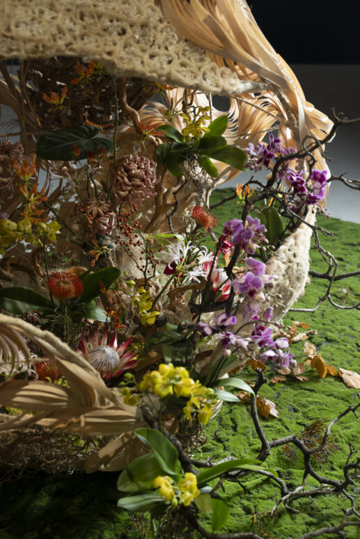 Một số tác phẩm còn dùng kỹ thuật treo lơ lửng (suspension floral) hoặc floating arrangement, khiến hoa như đang trôi giữa không gian – đó là những thiết kế đòi hỏi độ chính xác, hiểu biết sâu về kết cấu tự nhiên và tình yêu tuyệt đối dành cho từng cánh hoa.