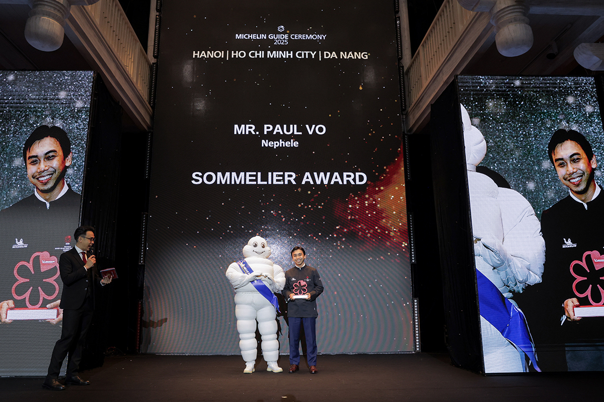 Giải thưởng Chuyên gia nếm rượu của MICHELIN Guide ghi nhận kỹ năng, kiến thức và niềm đam mê của những chuyên gia nếm rượu tài năng trong ngành. Giải thưởng Chuyên gia nếm rượu năm nay được trao cho anh Paul Võ đến từ Nephele – nhà hàng lần đầu tiên góp mặt trong danh sách MICHELIN Selected tại Thành phố Hồ Chí Minh. Paul hiện giữ vai trò Quản lý điều hành kiêm chuyên gia nếm rượu tại nhà hàng, anh đến từ Việt Nam và mang đến vốn hiểu biết sâu rộng về rượu vang để tạo nên trải nghiệm trọn vẹn cho thực khách. Paul xây dựng một thực đơn rượu vang độc đáo và cuốn hút, loại bỏ những lựa chọn thông thường để ưu tiên các dòng rượu đặc biệt, được sản xuất giới hạn với mức giá hợp lý. Với chuyên môn và sự duyên dáng của mình, Paul biến mỗi lần lựa chọn rượu trở thành một hành trình thưởng thức đầy thú vị dành cho thực khách.