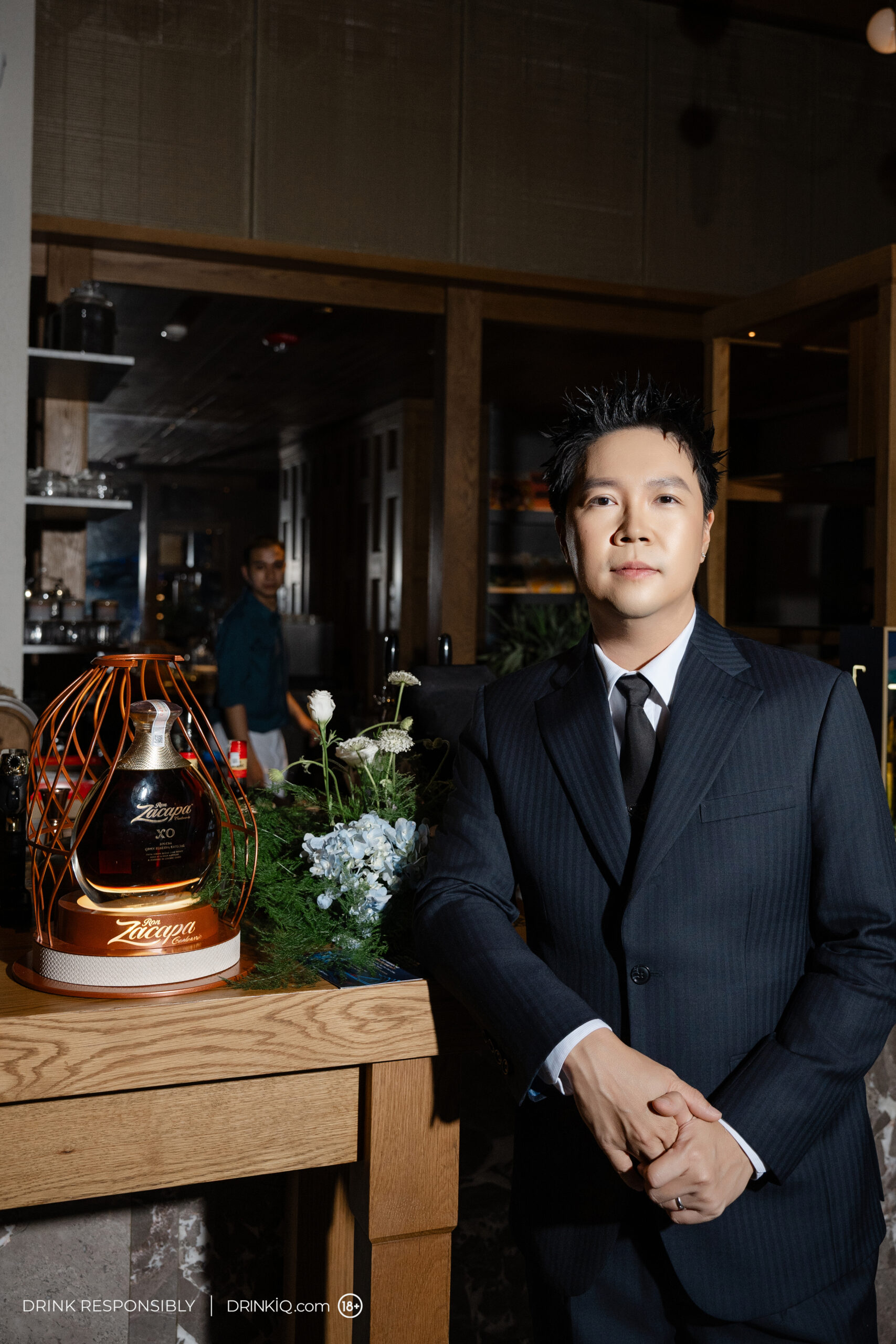 Ca sĩ Lê Hiếu bên cạnh tặng phẩm Zacapa XO với form mẫu hình cầu độc đáo.