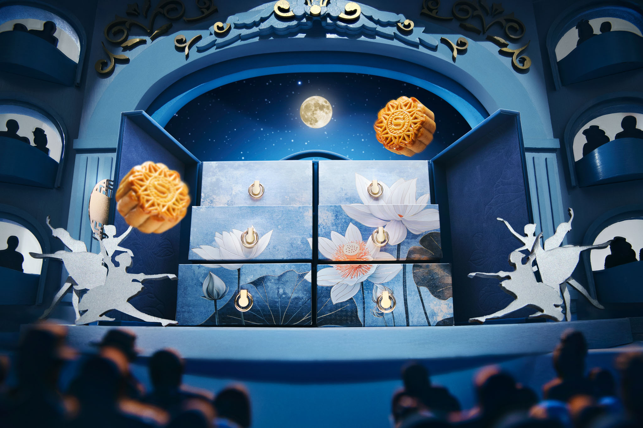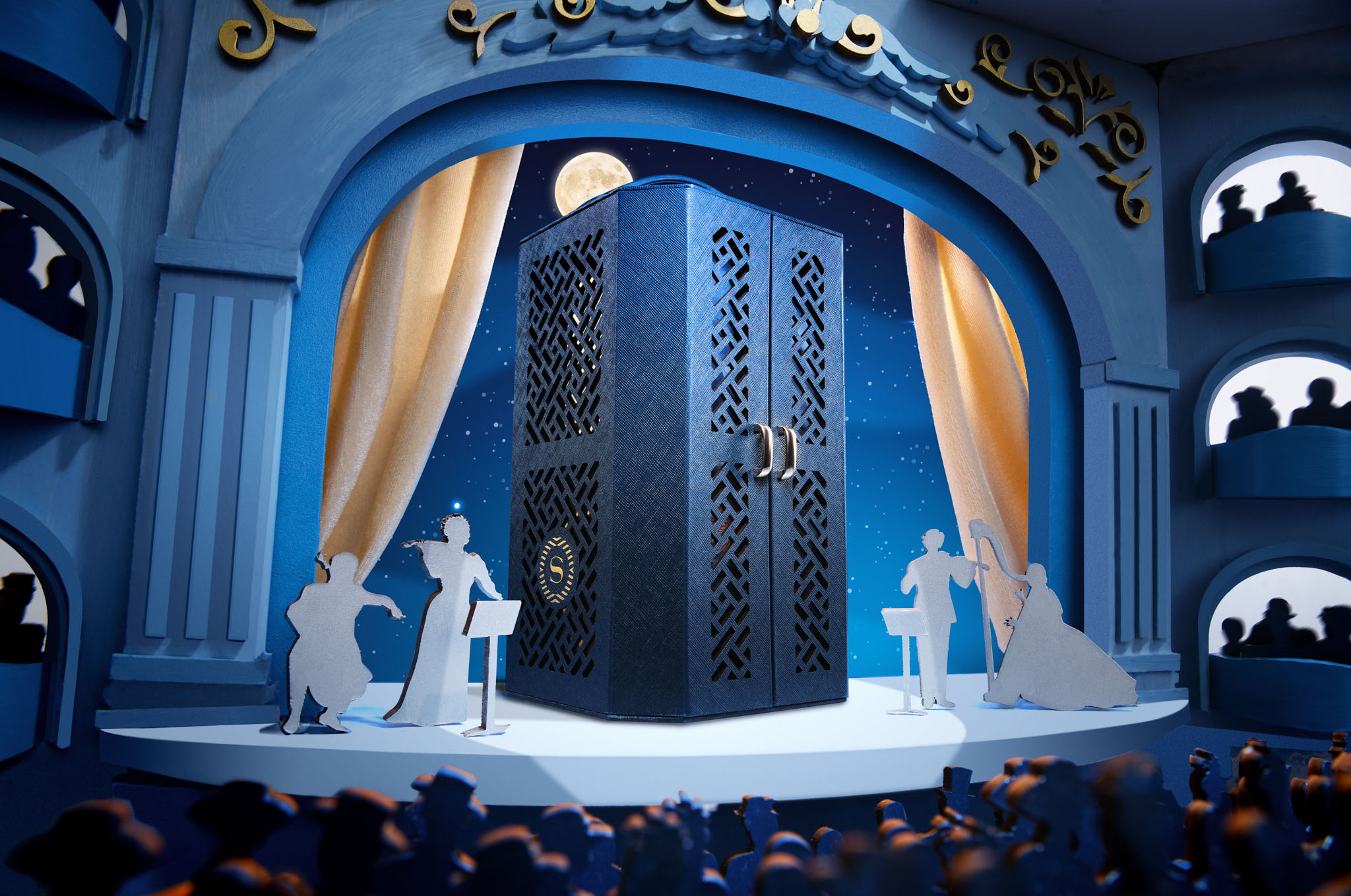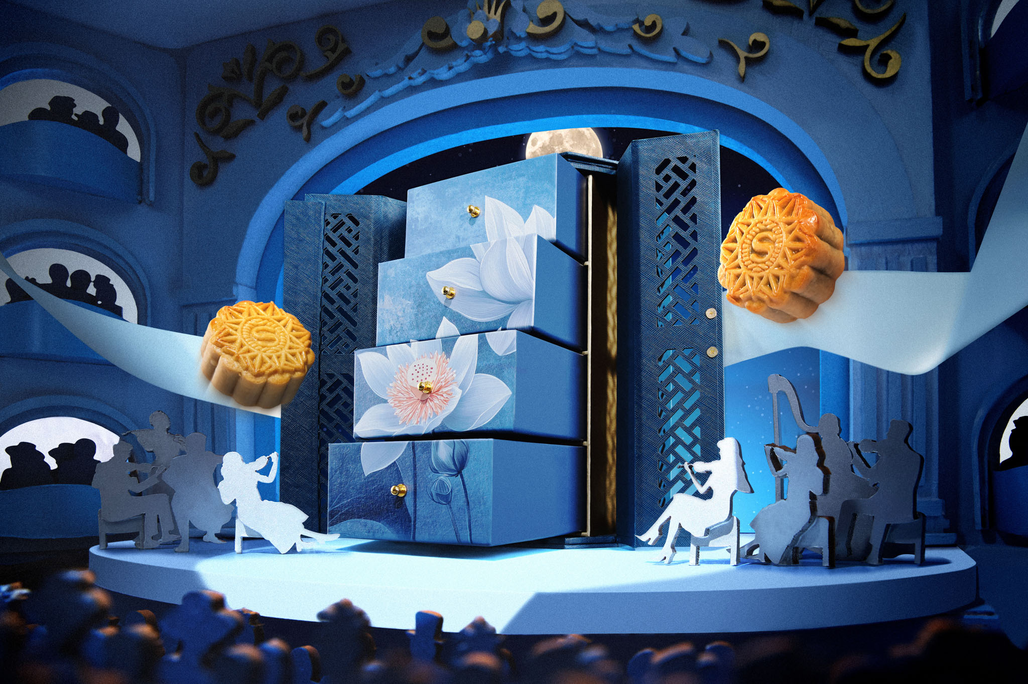 Khai Tấu là mở màn cho bản hòa tấu mùa trăng, hộp Khai Tấu mang dáng đứng thanh lịch, lấy cảm hứng từ lồng đèn truyền thống. Khoác sắc xanh Oxford trang nhã, hộp nổi bật với họa tiết cắt laser mô phỏng khung cửa nhà hát, tạo hiệu ứng ánh sáng đầy mê hoặc. Hộp Khai Tấu có thể tái sử dụng như hộp đựng đồ trang điểm hoặc ngăn kéo lưu giữ kỷ vật, kết hợp giữa vẻ đẹp tinh tế và ý thức bảo vệ môi trường.
