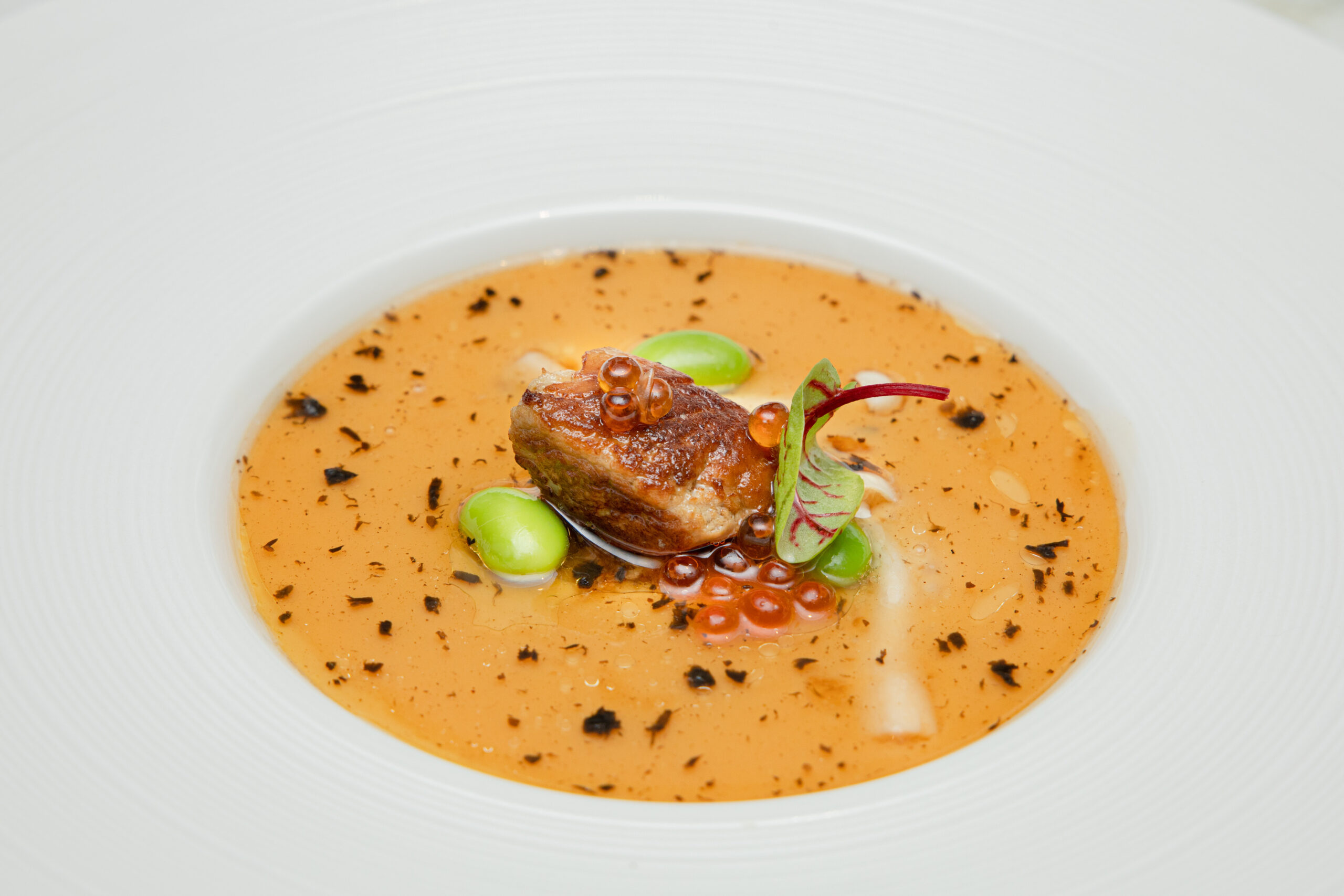 Dòng chảy vị giác bắt đầu chuyển mình qua từng cung bậc cảm xúc, bởi màn mở đầu của Khởi Nguyên, món khai vị nhẹ nhàng với bào ngư được nấu chậm trong bơ hảo hạng, hòa quyện cùng thạch thanh yên và trứng cá tầm Kaviari Osciètre, được ví như “viên ngọc trai đen” của biển cả.