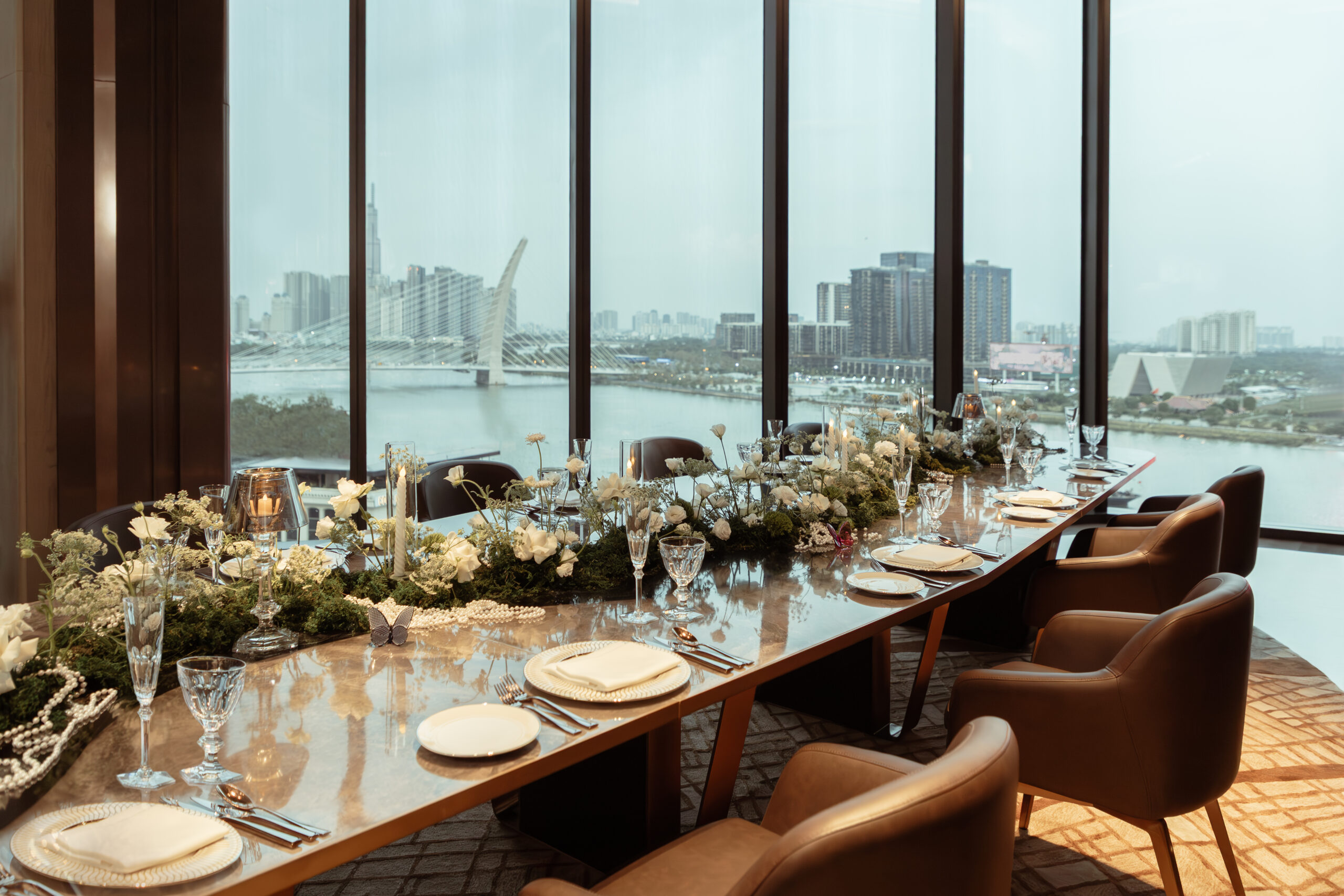 Điểm nhấn trong không gian là một bức tranh dạng lớn, với phong cách hiện đại tạo nên một ấn tượng đặc biệt và đầy cảm hứng. Sự kết hợp giữa kiến trúc đá mài độc đáo, vật liệu cao cấp được dung hòa với sự mềm mại của dòng sông Sài Gòn bên ngoài cửa kính, cùng điểm nhấn ấn tượng về mặt thị giác và tầm nhìn đắt giá giúp Gallery trở thành lựa chọn phù hợp cho các trải nghiệm tiệc thân mật và riêng biệt.