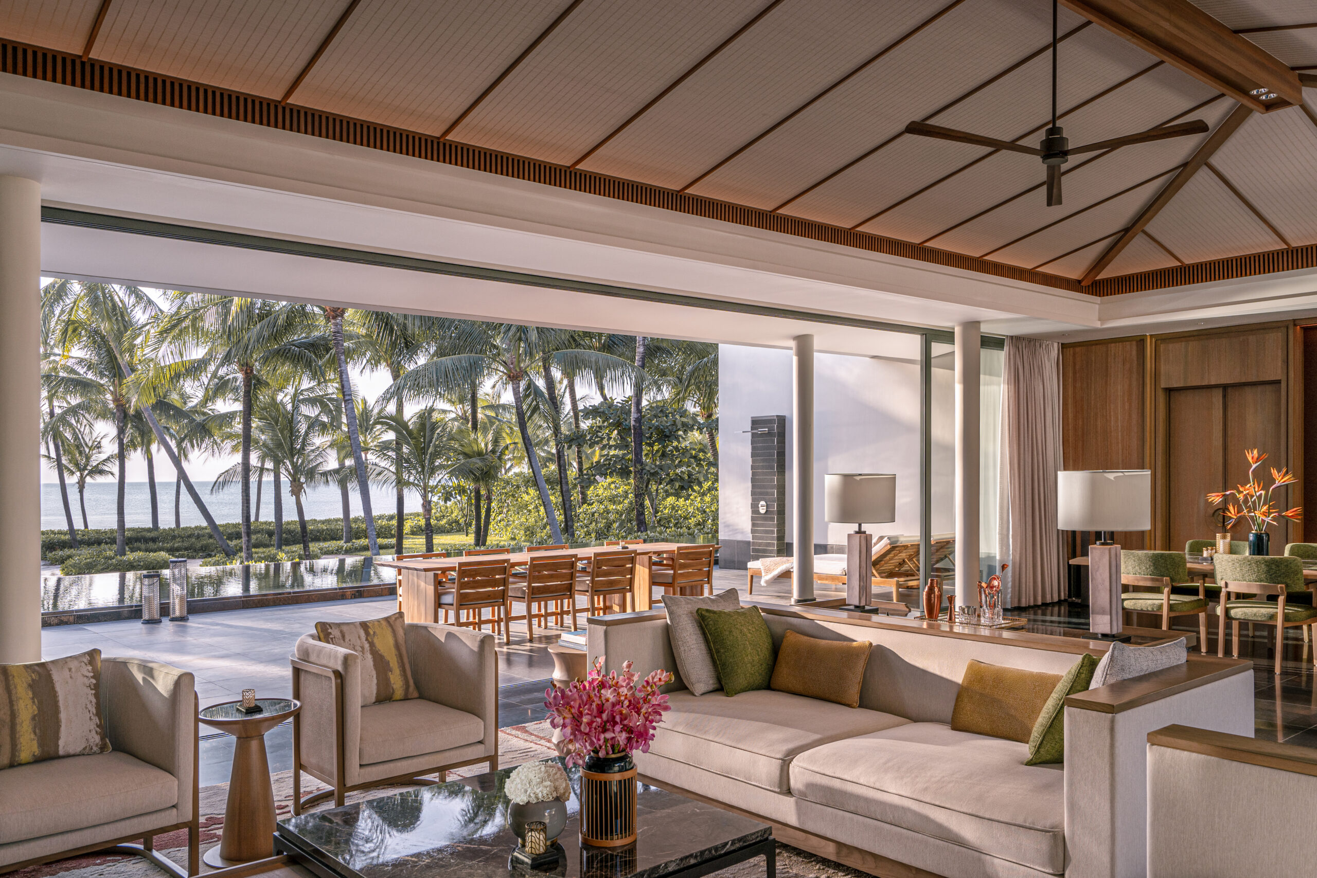 Mỗi Chủ nhật, từ 16:00 đến 18:00, Ocean Club trở thành tâm điểm thưởng ngoạn với nghi thức hoàng hôn đặc trưng bên bờ biển, nơi thực khách đắm chìm trong khoảnh khắc hoàng hôn dần buông ngoài khơi xa bên vịnh Thái Lan. Trong không gian thanh lịch và thư thái, dòng chảy bất tận của rượu Champagne Billecart-Salmon Brut Rosé danh tiếng được phục vụ cùng hàu David Hervé No.2 tươi ngon và trứng cá tầm Kaviari thượng hạng, kiến tạo nên trải nghiệm vị giác tinh tuyển. Khi tiếng kèn saxophone du dương hòa cùng sắc hồng ánh vàng rực rỡ của bầu trời, Pink Hour mở ra chương giao hòa hoàn mỹ, nơi sự tự tại và tinh thần lễ hội đặc trưng của Regent cùng thăng hoa bên bờ biển Phú Quốc.