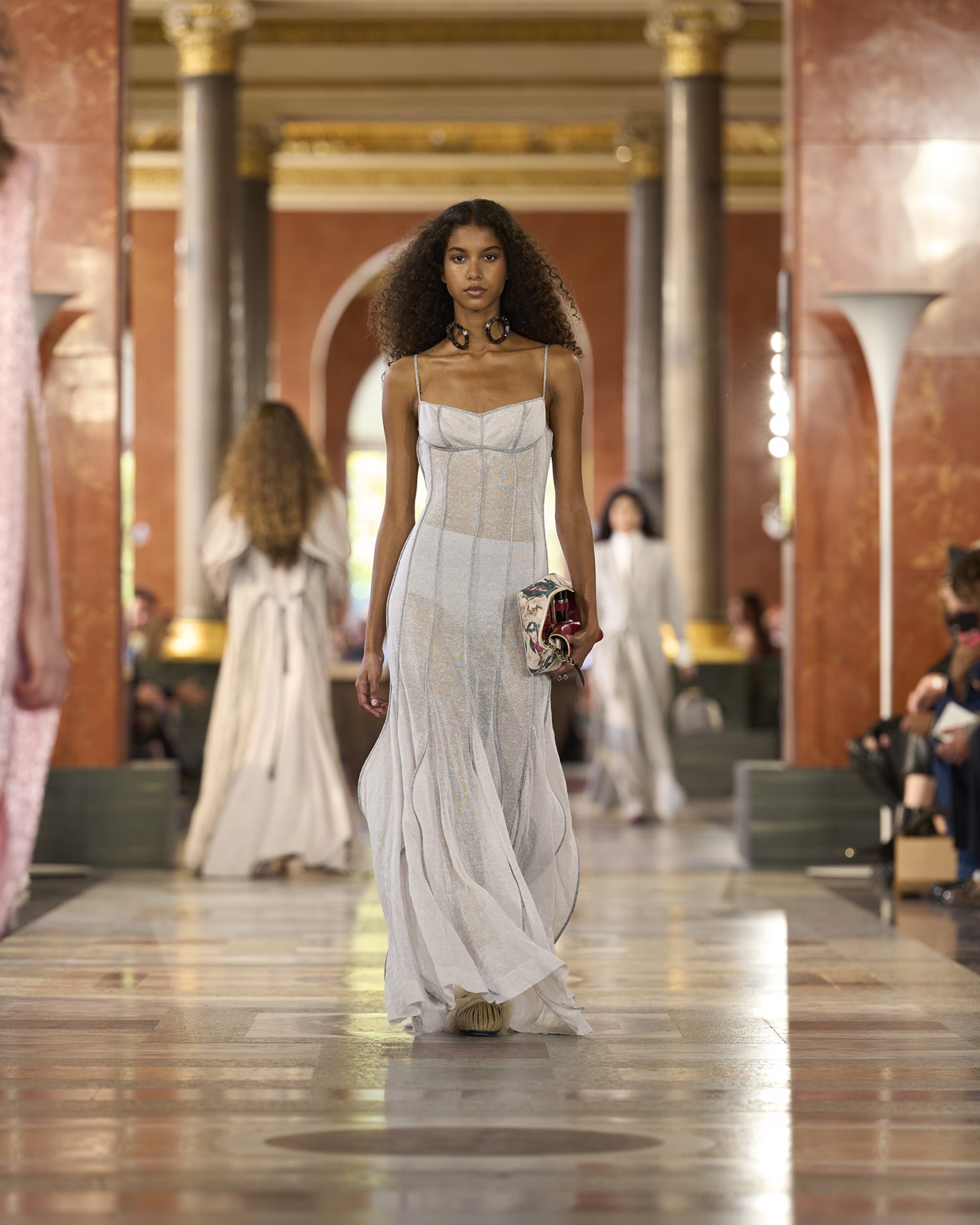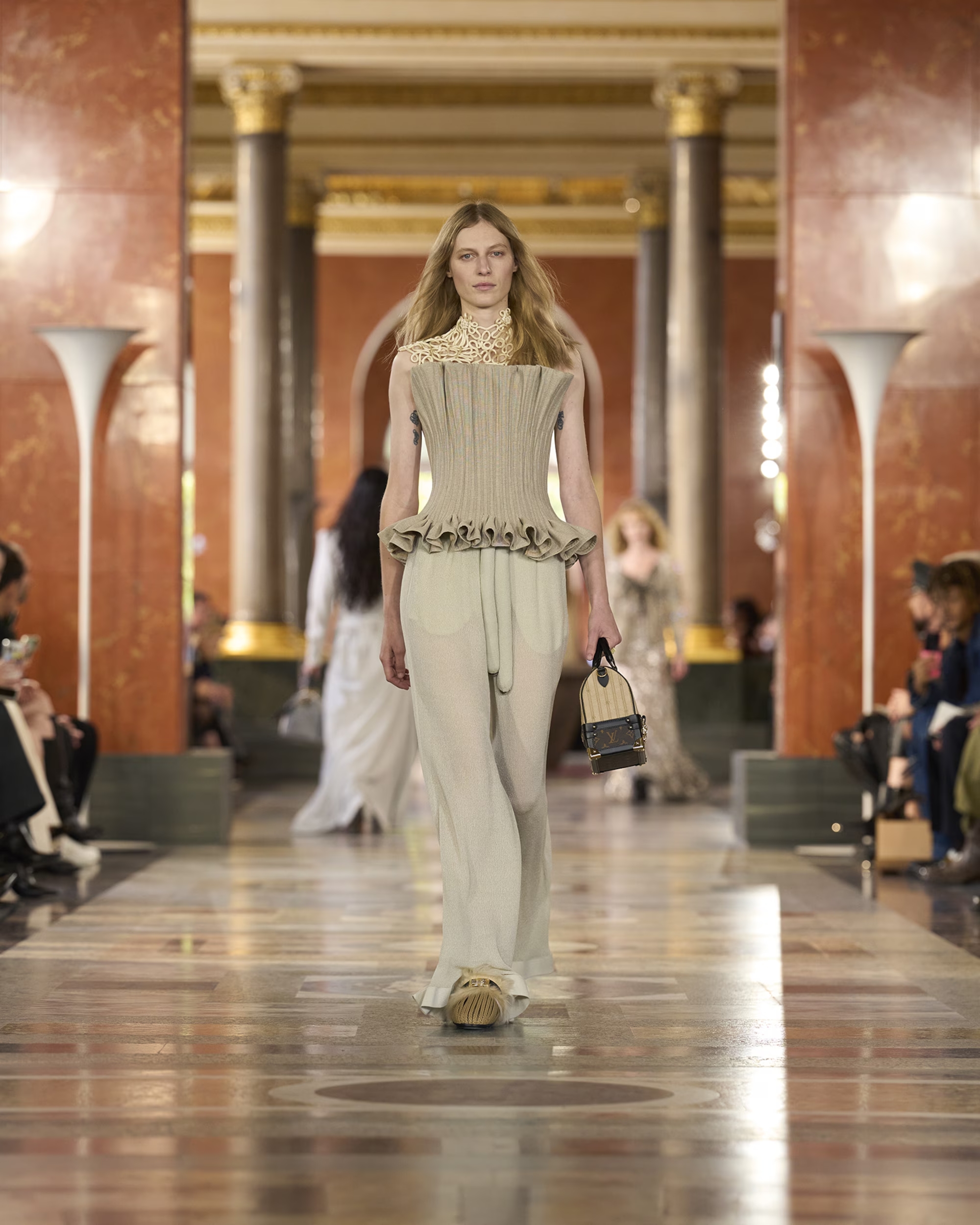 Tại nơi ở của Vương hậu Anne cao quý, mẹ của Louis XIV – “Le Roi Soleil” (Vua Mặt trời) của nước Pháp, nhà thiết kế bối cảnh Marie-Anne Derville đã tạo nên một căn hộ hiện đại bằng cách tuyển chọn đồ nội thất và các tác phẩm từ nhiều thời kỳ khác nhau, bao gồm các tác phẩm của họa sĩ Robert Wilson; thợ đóng đồ gỗ bậc thầy ở thế kỷ 18, Georges Jacob; những chiếc ghế Art Deco của Michel Dufet từ những năm 1930; các tác phẩm điêu khắc của nghệ nhân gốm sứ nổi tiếng trong thế kỷ 19, Pierre-Adrien Dalpayrat; và đồ nội thất do chính bà thiết kế. Marie-Anne Derville đã biến cuộc trưng bày bộ sưu tập Xuân-Hè 2026 của Louis Vuitton thành một chuyến du ngoạn xuyên không khám phá gu thẩm mỹ Pháp từ thế kỷ 18 đến nay.