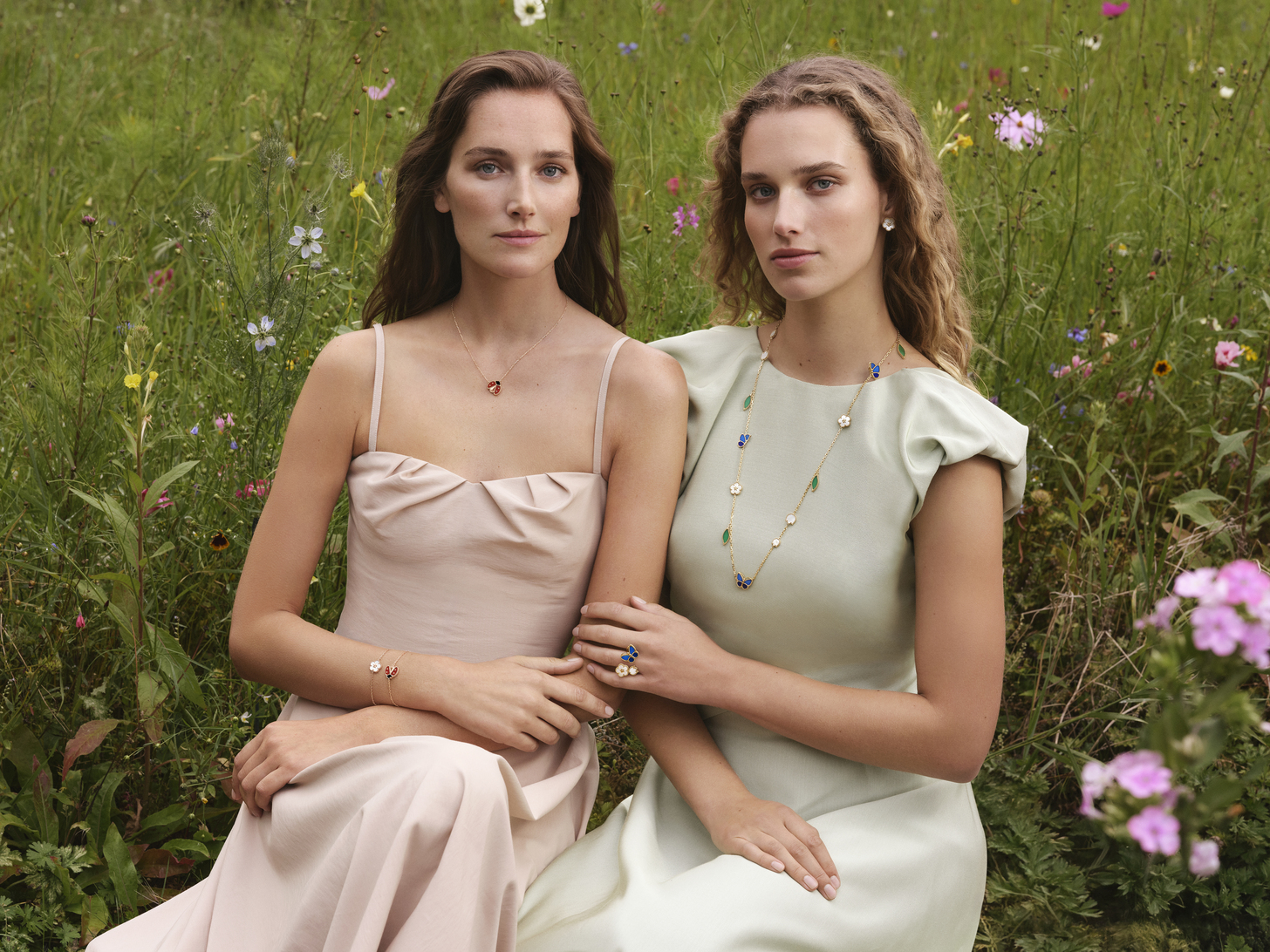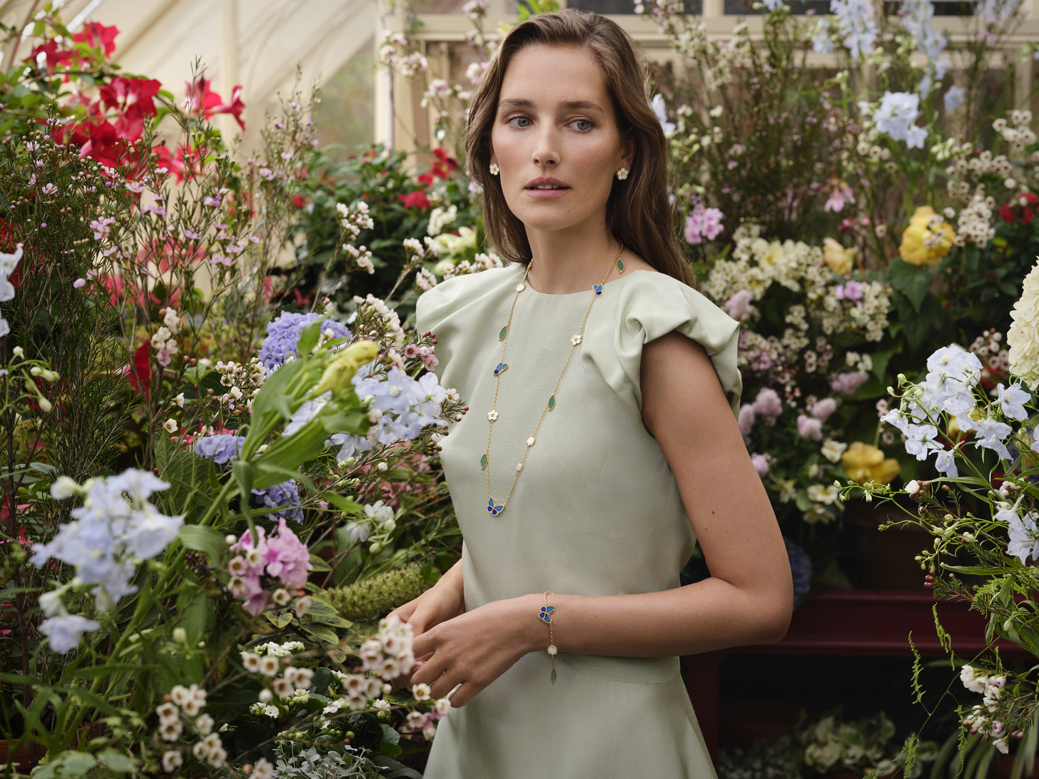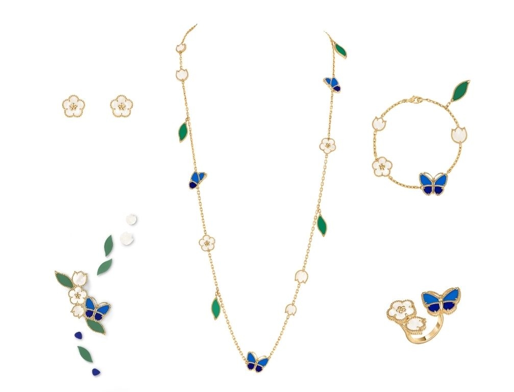 Bộ sưu tập Lucky Spring khắc họa hình ảnh chú bọ rùa bên những bông hoa mận, nụ linh lan và những chiếc lá mỏng manh. Năm nay, bộ sưu tập chào đón thêm sự xuất hiện của con bướm, họa tiết đã trở thành một phần di sản của Maison kể từ năm 1906. Thể hiện ý niệm về thiên nhiên tươi đẹp, mô-típ con bướm tôn vinh những chất liệu rực rỡ như đá mã não xanh và đá lapis lazuli, là minh chứng cho niềm say mê bền bỉ của Van Cleef & Arpels với các loại đá trang trí. Sắc độ của chúng càng được tôn vinh nhờ đường viền hạt kép đặc trưng của Maison.