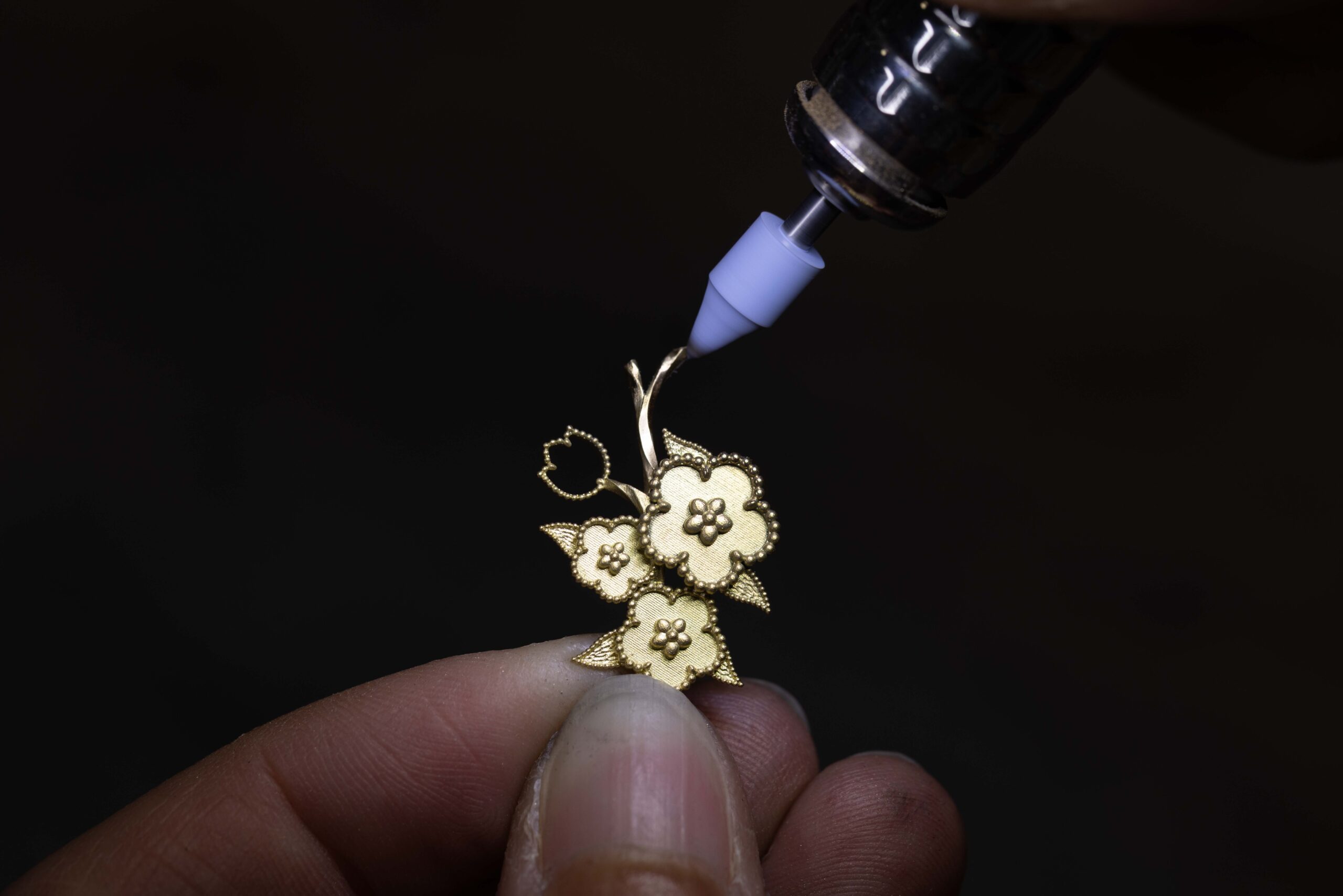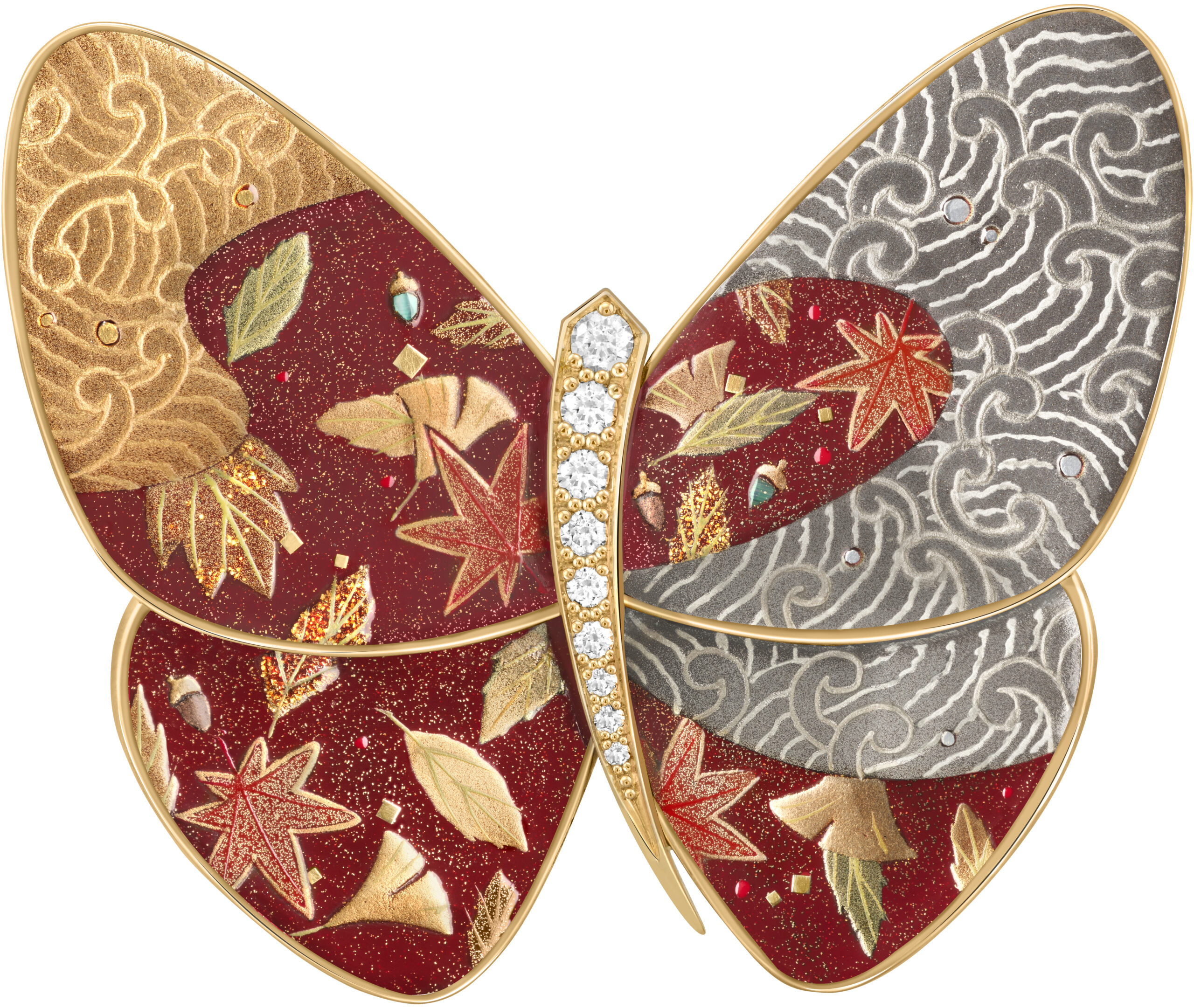 Bộ sưu tập Lucky Spring trước đây gồm các thiết kế bằng vàng hồng, nay được bổ sung 5 sáng tạo mới bằng vàng vàng: một chiếc dây chuyền dài, vòng tay 5 motif, một chiếc trâm cài áo, nhẫn Between the Finger và một đôi khuyên tai. Trên chiếc dây chuyền dài, hình ảnh con bướm xuất hiện ba lần. Được thể hiện luân phiên ở cả góc nghiêng và góc chính diện, cánh bướm như khẽ lay động theo sợi dây chuyền, tạo nên cảm giác sinh động và nhịp điệu bất đối xứng. Phần thân và râu bướm được chế tác từ vàng đánh bóng, thể hiện sự tỉ mỉ trong từng chi tiết của Maison. Tác phẩm được thực hiện theo kỹ thuật đúc sáp lỏng truyền thống, sau đó được nghệ nhân kim hoàn hoàn thiện thủ công. Ở mỗi công đoạn sản xuất, từng thiết kế đều được đánh bóng cả mặt trước, mặt sau và trên đường viền hạt kép nhằm tôn lên ánh sáng rạng rỡ của vàng.