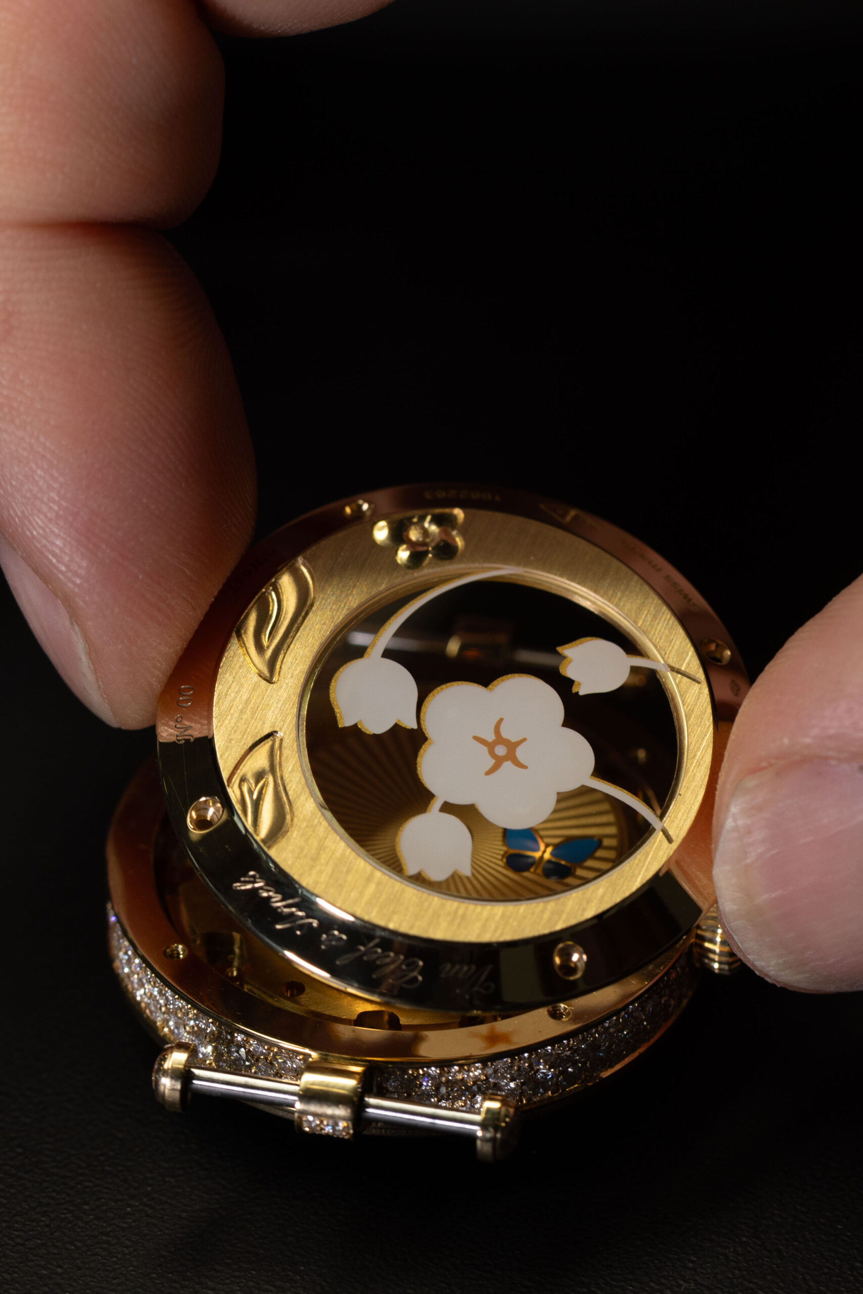 Nắp đáy của đồng hồ hé lộ bánh đà với hiệu ứng guilloché, trang trí hình một con bướm vẽ thu nhỏ. Là minh chứng cho chuyên môn cơ khí và nghệ thuật thủ công, chiếc đồng hồ này được lắp ráp hoàn toàn tại Xưởng Chế tác Đồng hồ của Van Cleef & Arpels ở Geneva.