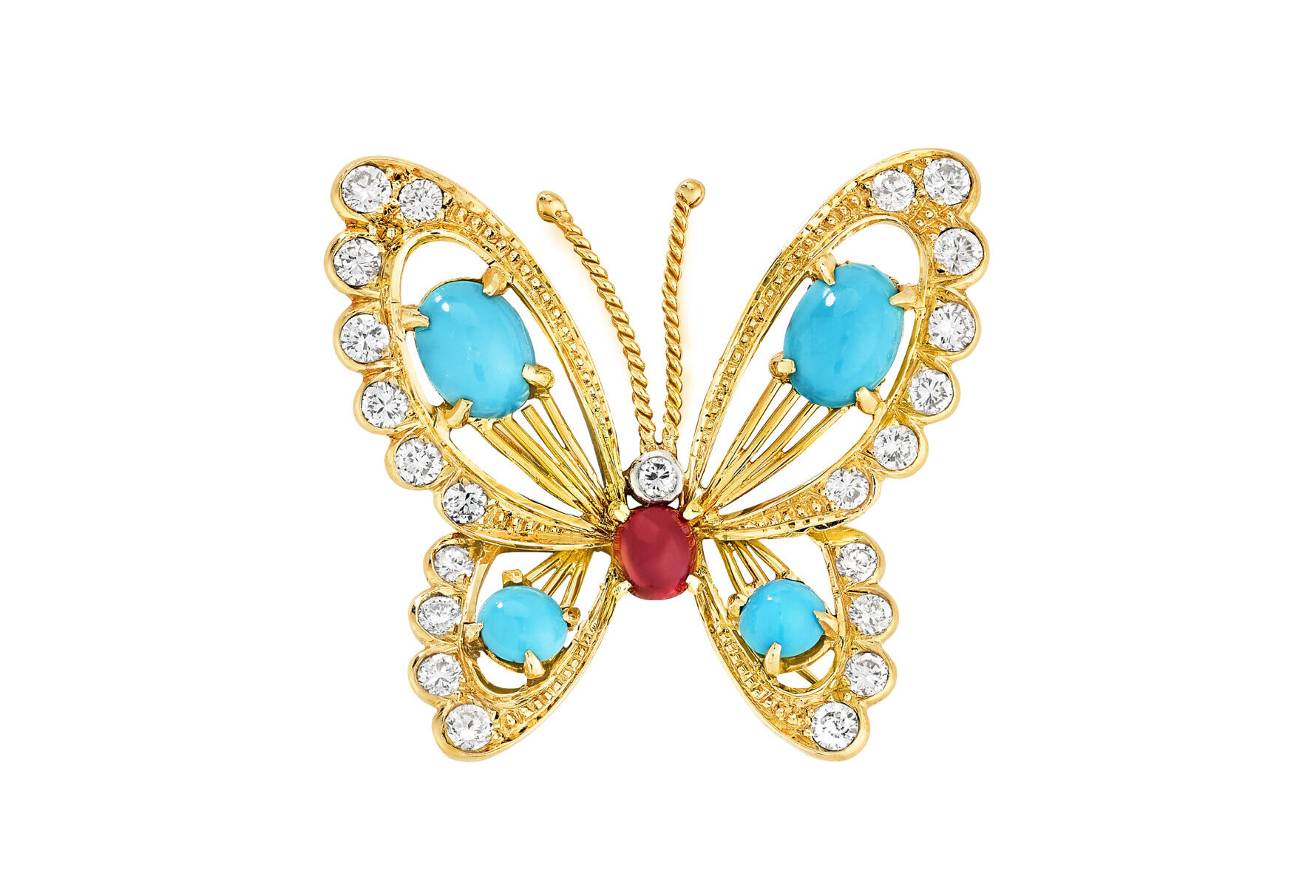 Trâm cài Butterfly, 1960; bằng yellow gold (vàng vàng), vàng trắng, vàng hồng, bạch kim, đá turquoise, hồng ngọc, kim cương. Thuộc Bộ sưu tập Van Cleef & Arpels.