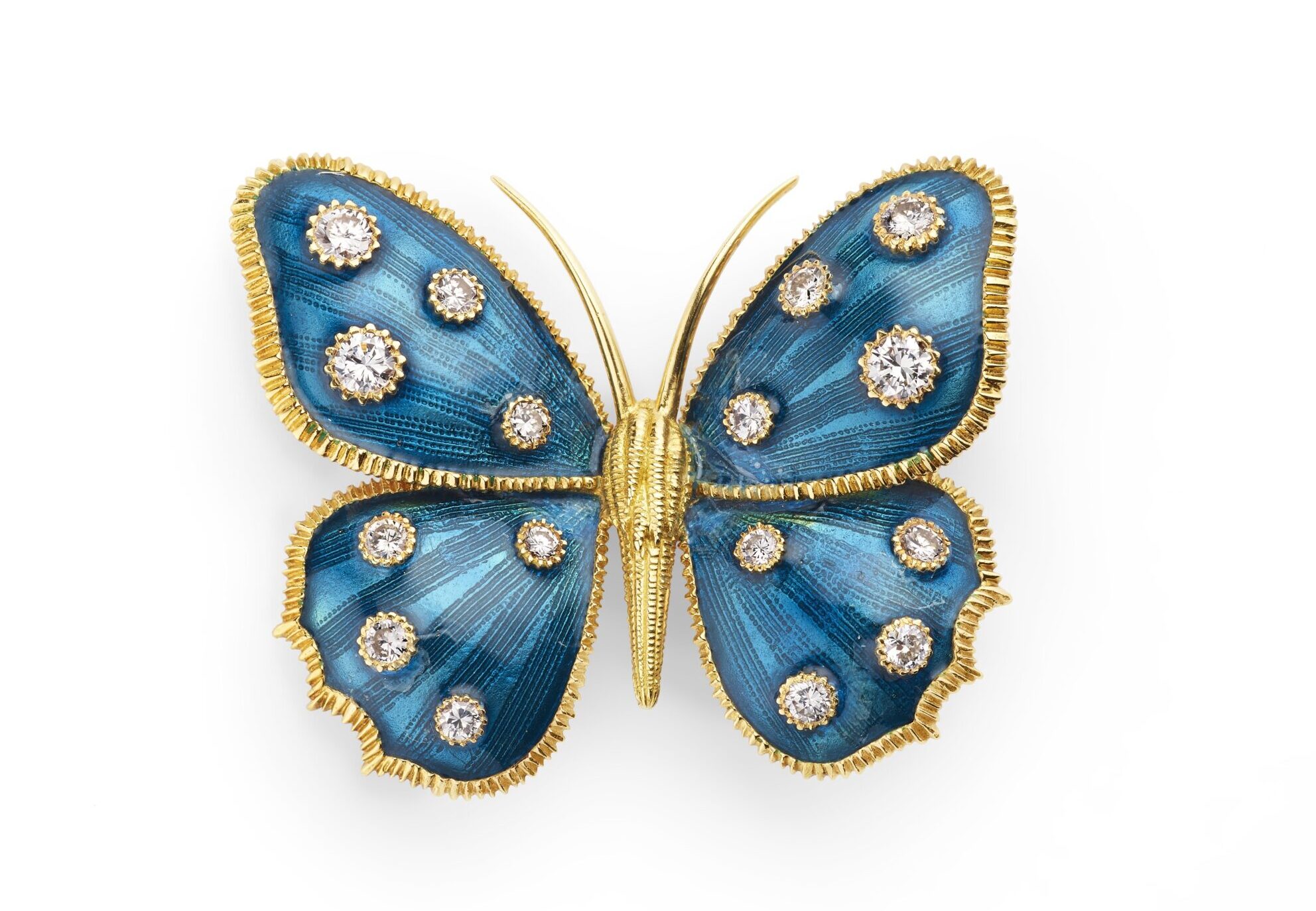 Trâm cài Night Butterfly, 1966; bằng yellow gold (vàng vàng), vàng trắng, men, kim cương. Thuộc Bộ sưu tập Van Cleef & Arpels.