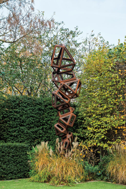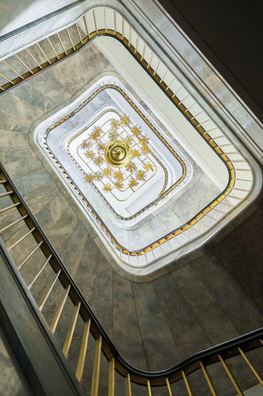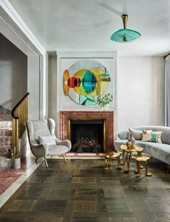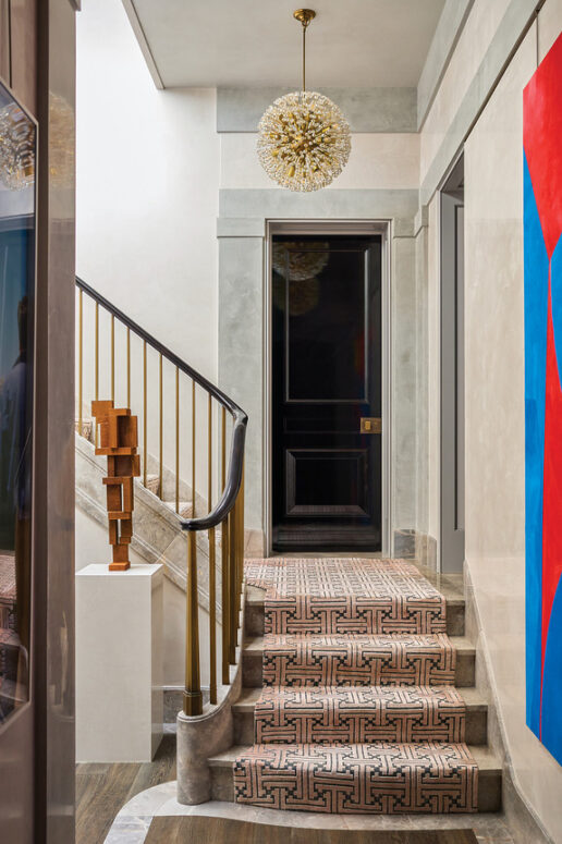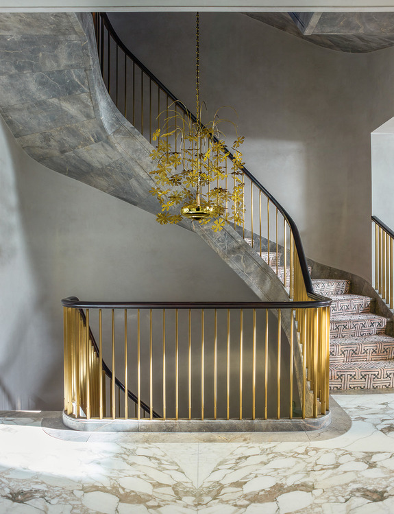 Cải tạo lại hoàn toàn, ngôi nhà năm tầng với sáu phòng ngủ giờ đây rộng hơn 6.000 foot vuông, có thêm tầng hầm và khoảng thông tầng ngập tràn ánh sáng. Tâm điểm là cầu thang xoắn ốc bằng đá Fior di Bosco màu xám, lấy cảm hứng từ Castletown House ở Ireland thế kỷ 18 – uốn lượn duyên dáng dưới giếng trời bằng đồng thủ công. “Tôi muốn tạo một điểm nhấn vừa gắn kết các tầng, vừa đưa ánh sáng lan toả khắp nhà,” Gambrel nói. “Những cầu thang đá kiểu Anh thực sự là một hình thức nghệ thuật.”