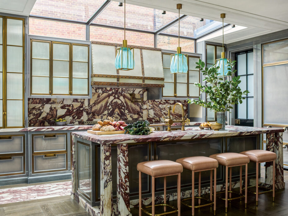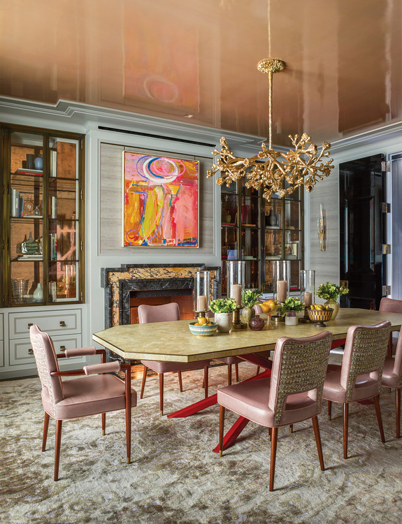 Dù có thể thiết kế những không gian trung tính tinh tế, Gambrel tỏa sáng nhất khi kết hợp màu sắc mạnh và chất liệu độc đáo. Trong bếp, anh chọn đá cẩm thạch Calacatta Vagli Rosato với vân đỏ thẫm cho bàn đảo và ốp tường, trong khi phòng ăn nổi bật với trần sơn bóng màu mơ, ghế da hồng Maison Leleu và bàn tám cạnh thiết kế riêng.