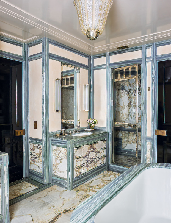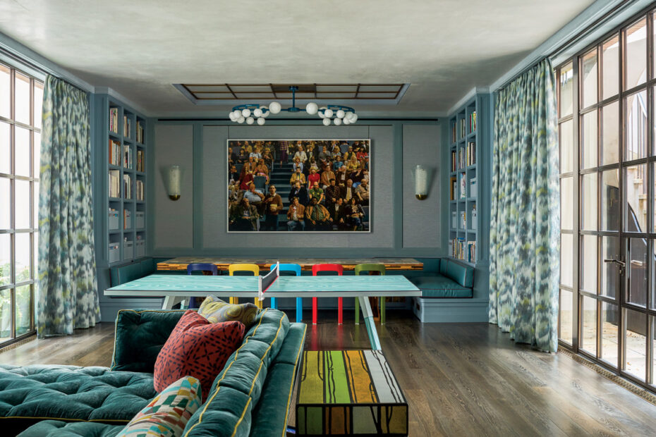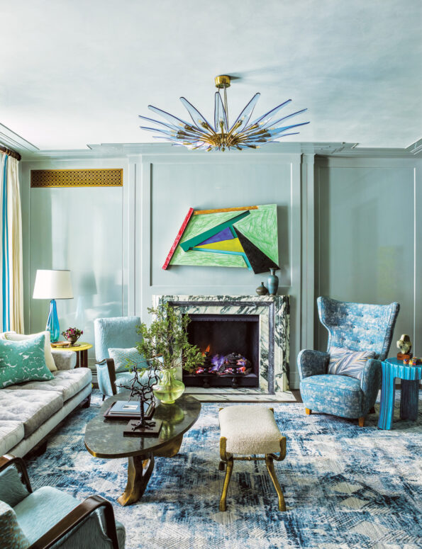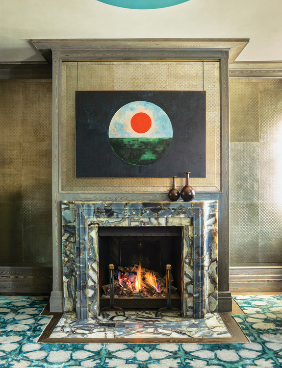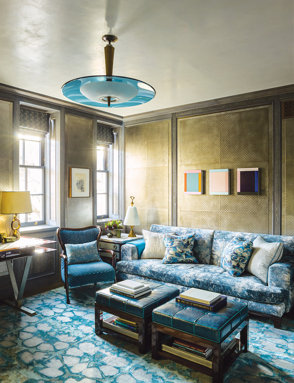 Ở phòng làm việc, tường bọc da dập nổi màu bạc khói kết hợp khung gỗ sẫm, trên đó treo các tác phẩm của Imi Knoebel và Albert Oehlen. Phòng khách lại rực rỡ trong dải xanh lam và bạc, với ghế bành Ý thập niên 1950, bàn cocktail của Philip & Kelvin LaVerne thập niên 1970 và đèn chùm Max Ingrand – tất cả mang tinh thần pha trộn đầy kịch tính.