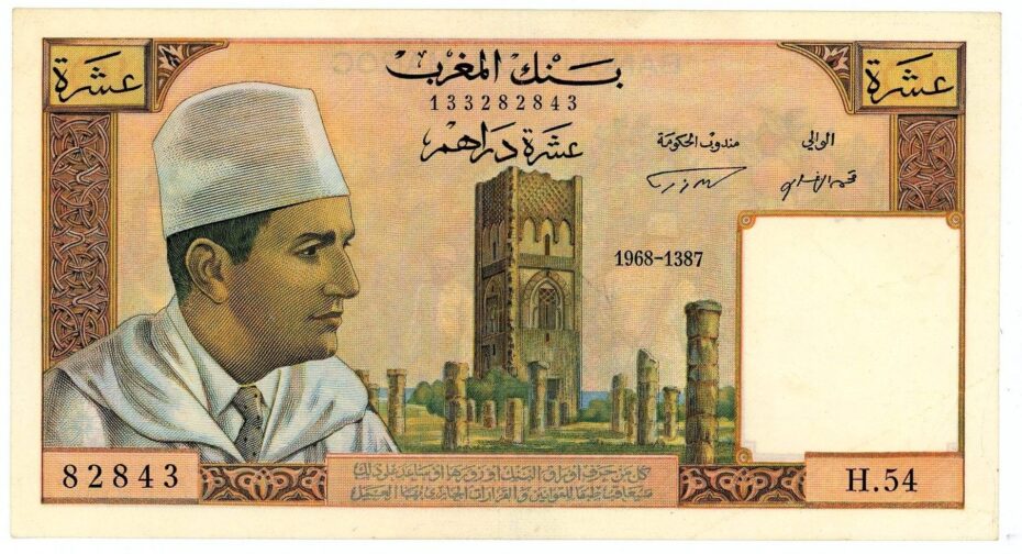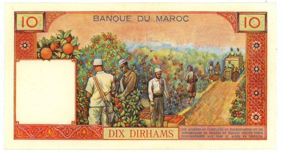 - Mặt trước tờ tiền giấy 10 dirham, phát hành vào năm 1960, in hình chân dung đức vua Mohammed V mặc áo trắng bên trái, trung tâm là quảng trường và tháp Hassan, mặt sau là khung cảnh nông dân thu hoạch trái cây. Kiểu tiền giấy 10 dirham này đã hủy lưu hành ở Maroc kể từ ngày 31 tháng 12 năm 2011. Nguồn: Numista