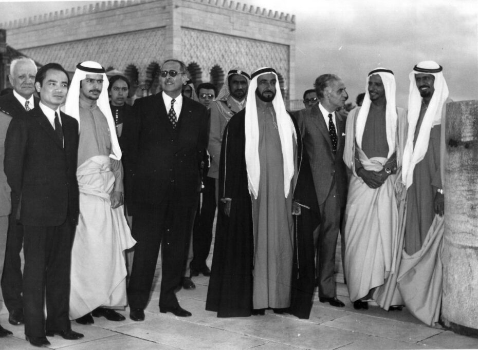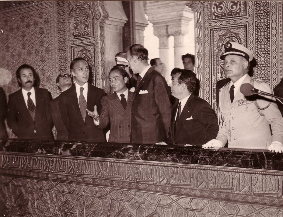 Kiến trúc sư Eric Võ Toàn làm việc trên bản vẽ cùng vua Hassan II và các công sự, ngay trước một phần công trình đang xây dựng của tổ hợp tưởng niệm ở Rabat, ảnh chụp trong khoảng thời gian 1961–1971. Nguồn: rol-benzaken.centerblog.net