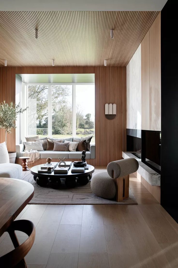 Sàn gỗ và mảng ốp tường bằng gỗ hài hòa với hệ khung gỗ chạy gân của ghế nghỉ bên cửa sổ, tạo nên một không gian giàu cảm xúc vật liệu xoay quanh cùng một chất liệu chủ đạo. Ảnh: Martha Stewart
