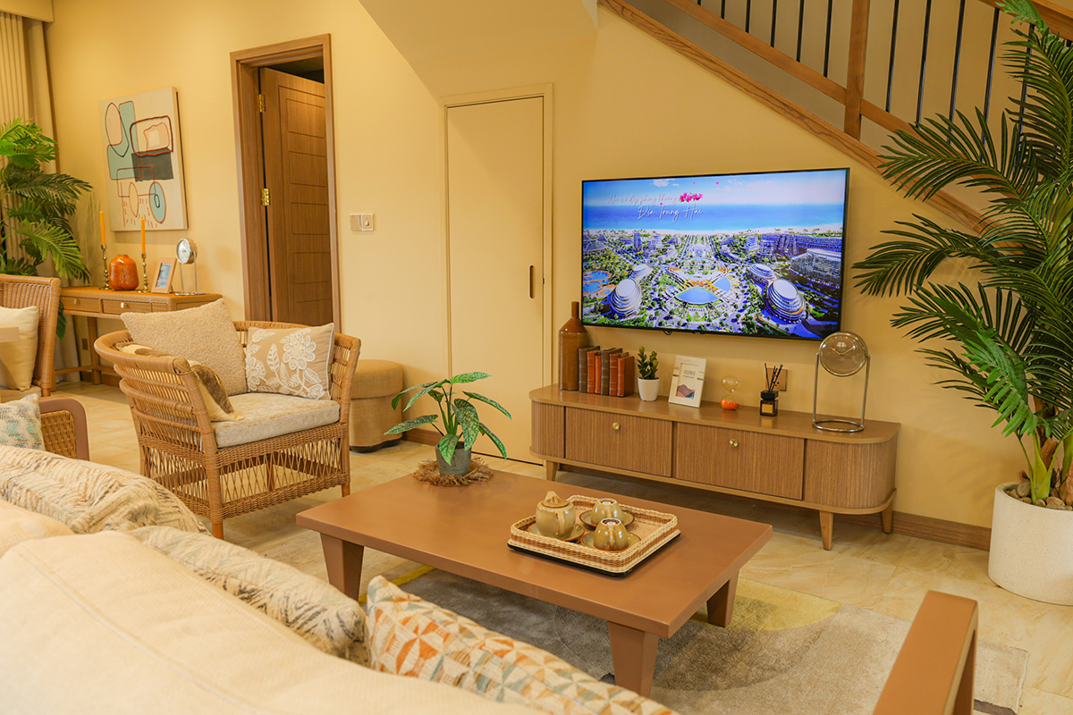 Phòng khách được tổ chức theo hướng mở, với bố cục quây quần quanh bàn trà trung tâm. Sofa, ghế mây và kệ thấp tạo nên một nhịp điệu nhẹ nhàng, vừa đủ để định hình không gian mà vẫn giữ được sự thư giãn. Các chi tiết trang trí và cây xanh được tiết chế vừa đủ, mang lại tổng thể dễ chịu và giàu tính thư giãn.