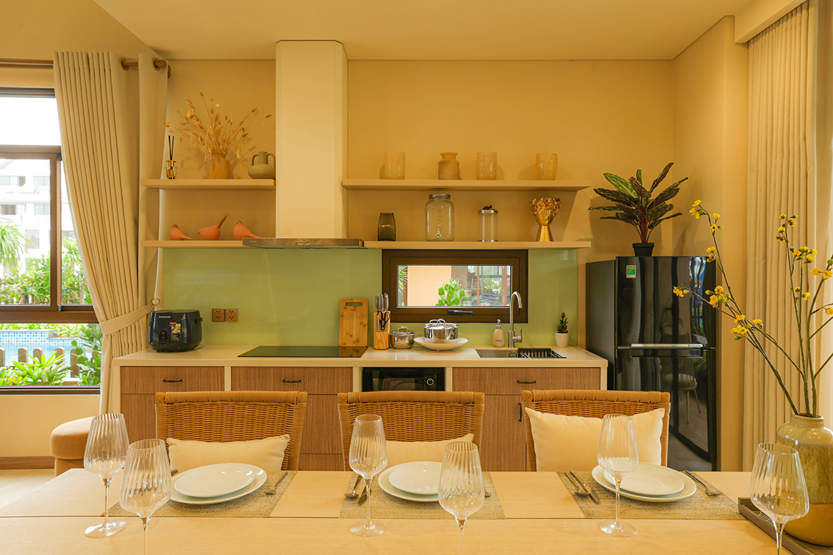 Liền kề là khu vực bếp được thiết kế tối giản, tiện dụng với hệ tủ gỗ kết hợp mặt bếp sáng màu. Mảng tường xanh nhạt tạo điểm nhấn thị giác, giúp không gian trở nên dịu mắt. Kệ mở phía trên vừa tăng tính thẩm mỹ vừa đảm bảo công năng sử dụng. Kệ mở và bàn ăn đồng bộ vật liệu mây – gỗ tạo nên sự liên kết tự nhiên, mang lại cảm giác liền lạc trong tổng thể.