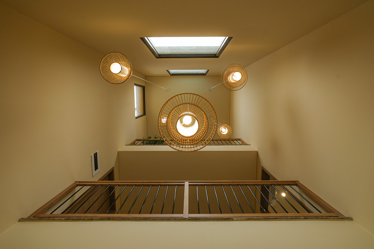 Tại khu vực thông tầng, hệ đèn mây tre đan trở thành điểm nhấn nổi bật. Các cụm đèn được thả theo nhiều cao độ, kết hợp cùng ánh sáng tự nhiên từ giếng trời, tạo nên hiệu ứng ánh sáng đa lớp – vừa ấm áp, vừa giàu chiều sâu thị giác. Đây cũng là chi tiết thể hiện rõ nét tinh thần thủ công đặc trưng của phong cách Ma-rốc.