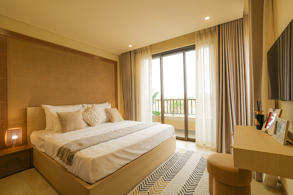 Phòng ngủ được thiết kế theo hướng tối giản. Giường thấp, vật liệu gỗ sáng và bảng màu trung tính giúp giảm thiểu cảm giác nặng nề, trong khi ban công mở đóng vai trò kết nối trực tiếp với thiên nhiên, mang lại sự thông thoáng và dễ chịu cho toàn bộ căn phòng.