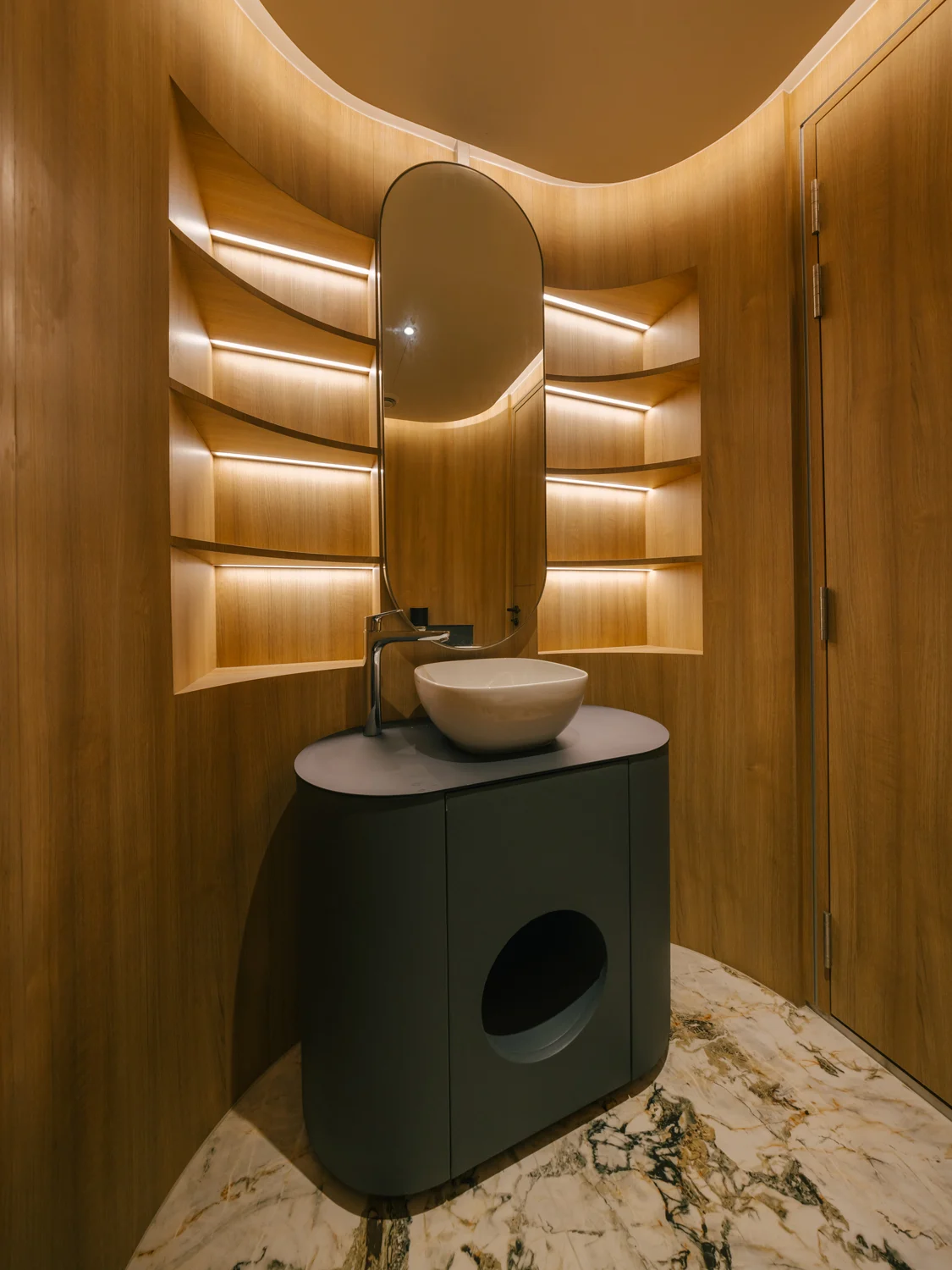 Không gian sống – Sekiso House – Phòng tắm sang trọng – LUXUO ← Previous Next → Đá thiêu kết trông giống đá cẩm thạch tạo hiệu ứng trang trí cho phòng vệ sinh. Ảnh: Finbarr Fallon