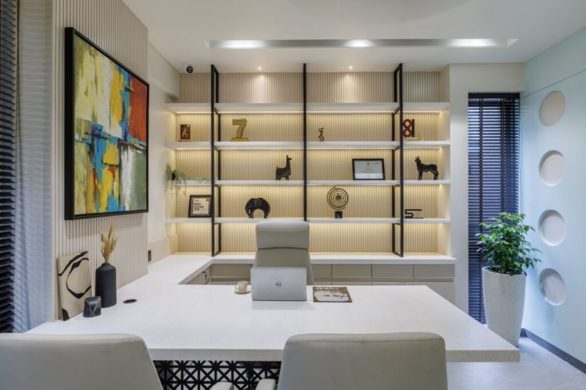 Phòng làm việc lại cần sự tỉnh táo và tập trung nhưng không thể thiếu phần cho cảm hứng. Vẫn là nền trung tính tạo sự yên tĩnh cho tư duy kết hợp các màu nhấn như xanh ngọc, vàng chanh hay cam nhạt – nếu được sử dụng đúng mức sẽ kích thích sự sáng tạo và giữ cho tâm trí tỉnh táo. Những điểm nhấn này có thể đến từ một bức tranh, một chiếc ghế hay đơn giản là vài món phụ kiện trên bàn làm việc, vừa đủ để đánh thức cảm hứng mà không gây nhiễu loạn thị giác.