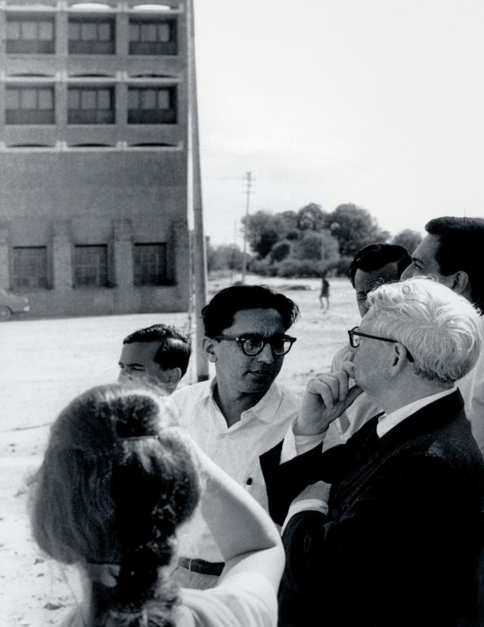 Doshi làm việc với Louis Kahn trong dự án xây dựng Viện Thiết kế Quốc gia (NID) tại Ahmedabad. Ảnh: Studio Sangath
