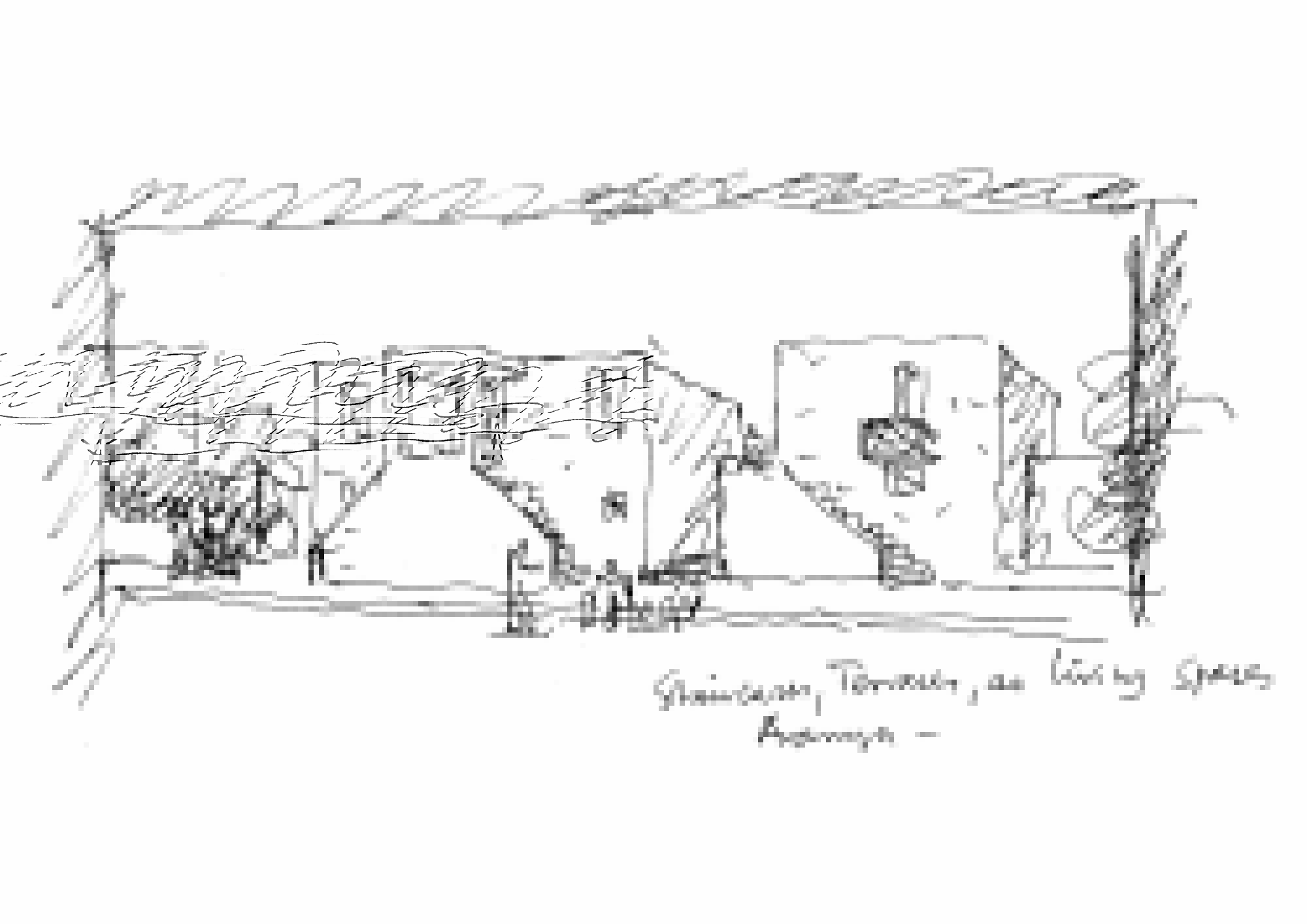 Bản phác thảo khu dân cư Aranya của kiến trúc sư Balkrishna Doshi, với dòng chữ “Staircases, Terraces, as living spaces” (Cầu thang, hàng hiên, như là không gian sống). Ảnh: Vastu-Shilpa Foundation