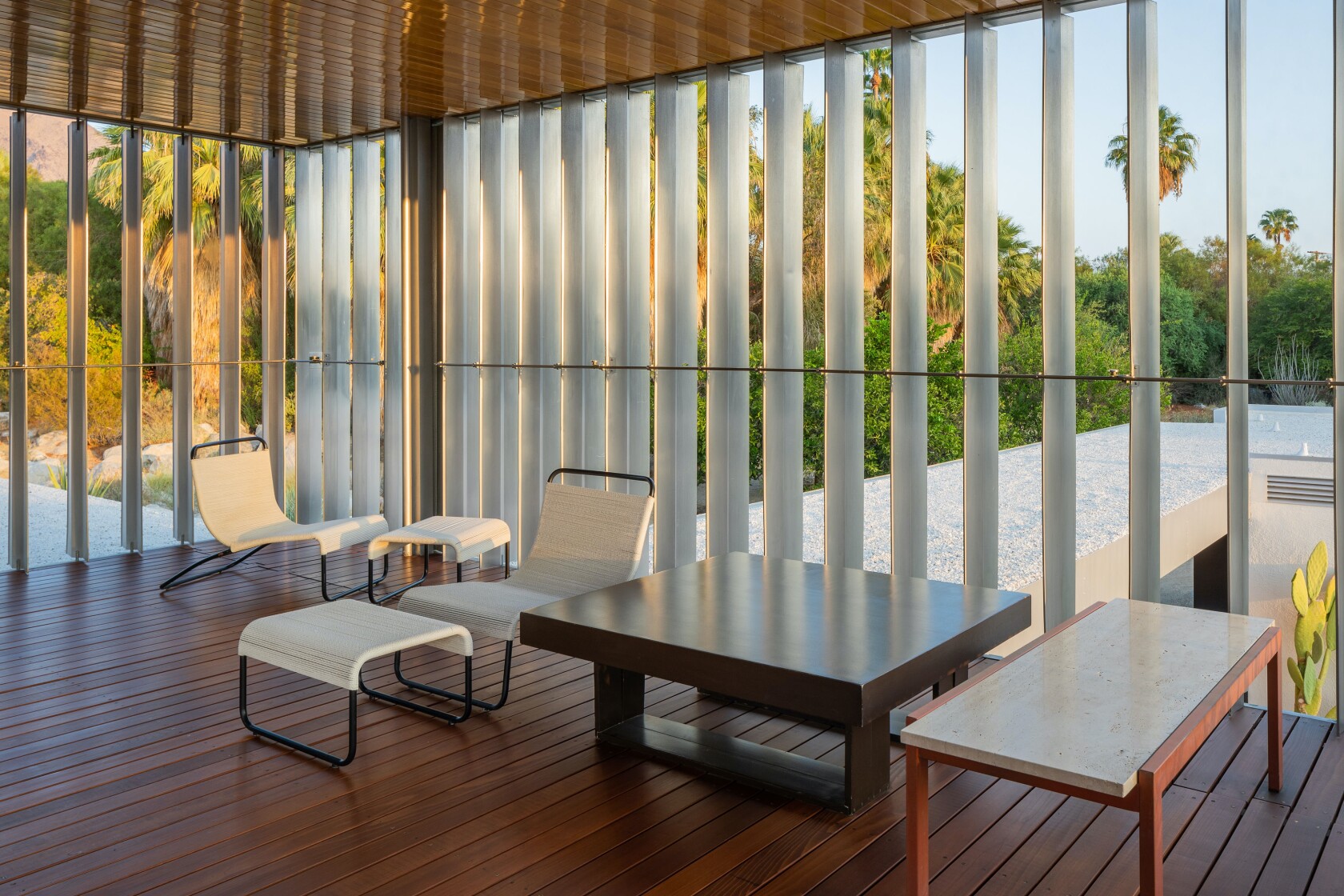 Bậc thầy kiến trúc theo chủ nghĩa hiện đại đã xây ngôi nhà 5 phòng ngủ và nhấn mạnh sự kết nối tương thuộc với cảnh quan sa mạc xung quanh. Những tường kính trượt lớn mở ra các phòng và sân thượng, hồ bơi cũng như khu vườn mang tính biểu tượng, mở đường cho khái niệm sống “indoor outdoor”.
