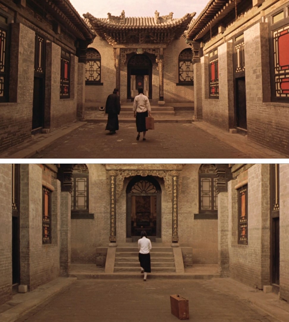 Những cú máy toàn cảnh từ trên cao nhìn xuống các khoảng sân, thấy rõ từng bà vợ di chuyển như những cá thể bị quan sát và cô lập trong một không gian đã được sắp đặt. Họ bị đóng khung bởi những bức tường, mái nhà và song cửa. Không có một lối thoát nào trong tầm mắt. Các đường thẳng của kiến trúc như cột nhà, bậc thềm, hành lang dài hun hút, tạo thành một mạng lưới, một cái lồng vô hình trói buộc nhân vật. Khi Tùng Liên lần đầu bước vào, cô di chuyển từ sân này qua sân khác, và mỗi khoảng sân gần như giống hệt nhau. Đó là sự lặp lại có chủ ý của đạo diễn, nhấn mạnh tính tuần hoàn vô vọng và sự đơn điệu đến tàn nhẫn của cuộc đời cô từ đây về sau.