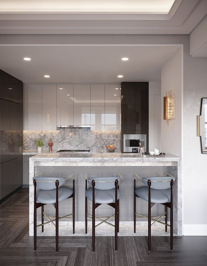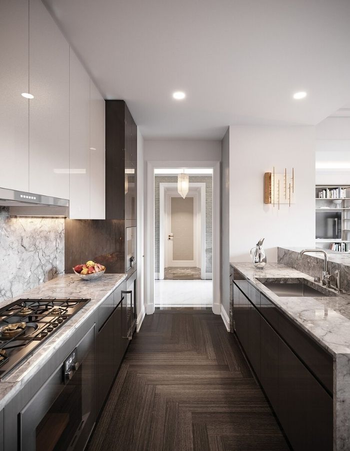 Không gian sống trong mỗi căn hộ là minh chứng cho nghệ thuật chế tác đỉnh cao. Những khung cửa sổ được tái hiện theo thiết kế gốc, mở ra tầm nhìn toàn cảnh New York. Khu bếp mang dấu ấn của Deniot với hệ tủ gỗ và sơn mài chế tác bởi Molteni&C (Ý), kết hợp cùng thiết bị bếp Gaggenau (Đức), tạo nên trải nghiệm nấu nướng vừa tiện nghi vừa tinh tế. Phòng tắm được chăm chút với sàn sưởi, vòi tắm mưa, bàn trang điểm Ý, tất cả đều khẳng định chuẩn mực sống sang trọng đến từng chi tiết. Vật liệu tự nhiên cùng kỹ nghệ thủ công tinh xảo, điểm xuyết bằng những đường nét Art Deco, làm nên bản sắc riêng biệt cho mỗi không gian.